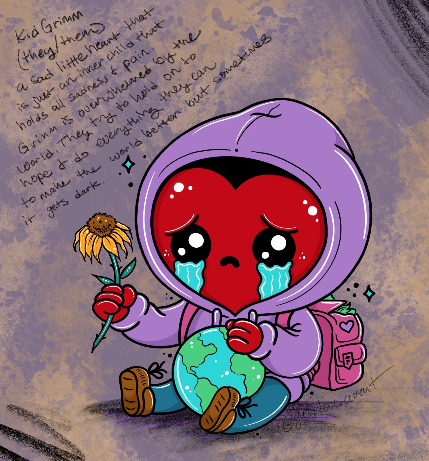 (they/them) a sad little heart that is just a inner child that holds all sadness and pain. Grimm is overwhelmed by the world. They try to hold on to hope and do everything they can to make the world better but sometimes it gets dark.