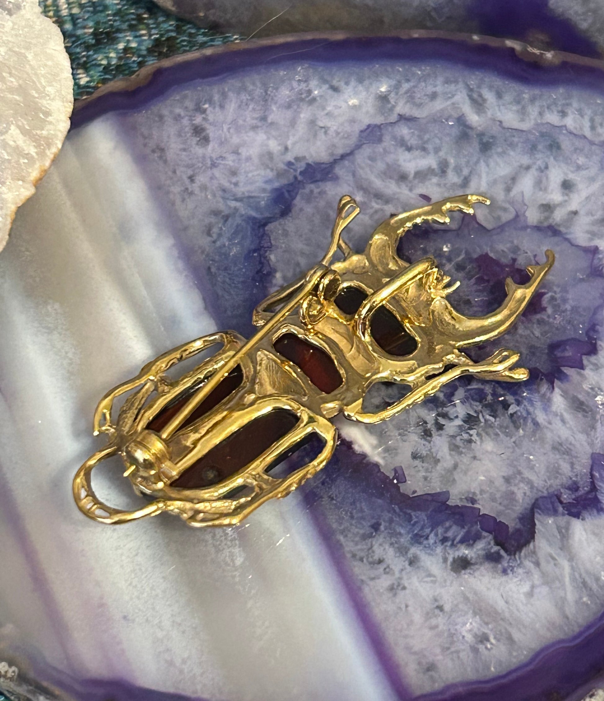 Gorgeous 2 inch long 14k gold over sterling silver stag beetle pin with natural cherry amber stone. Can be used as a pin or pendant.