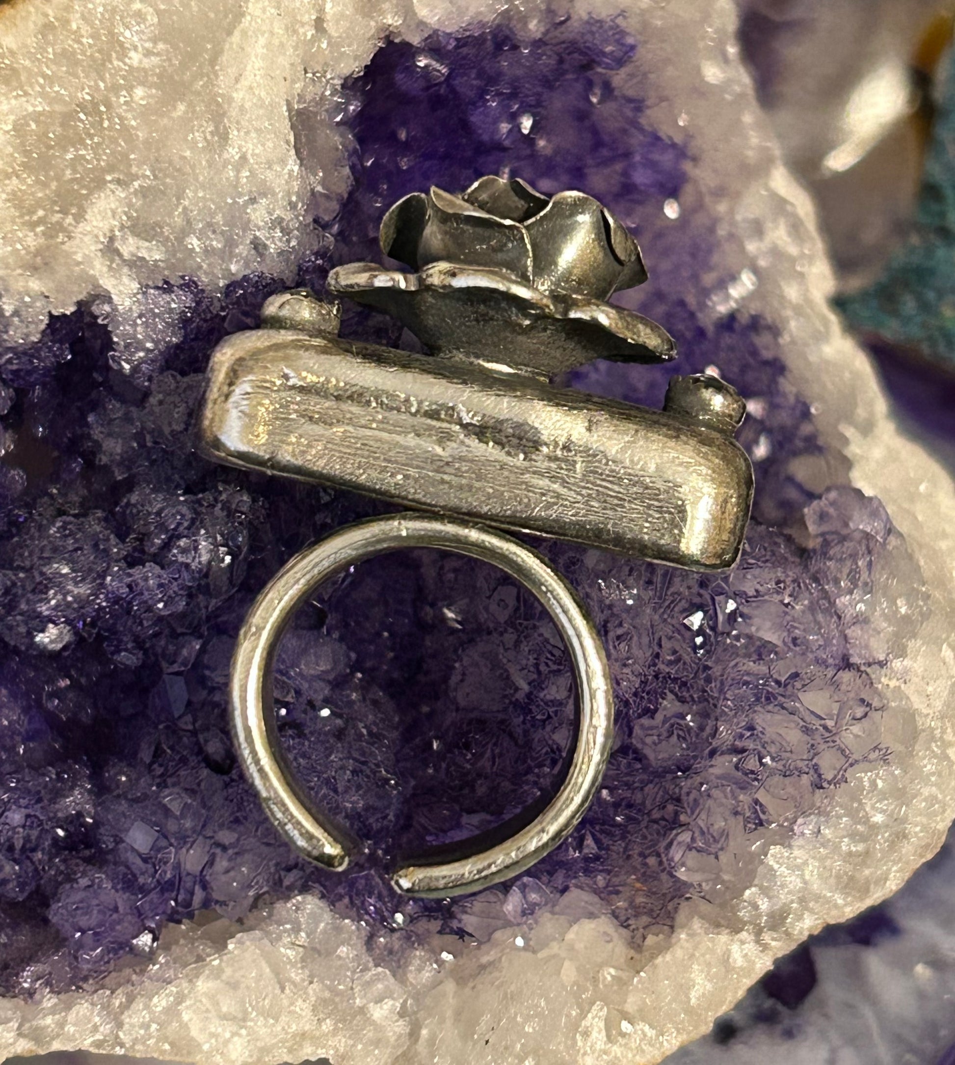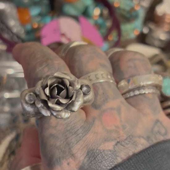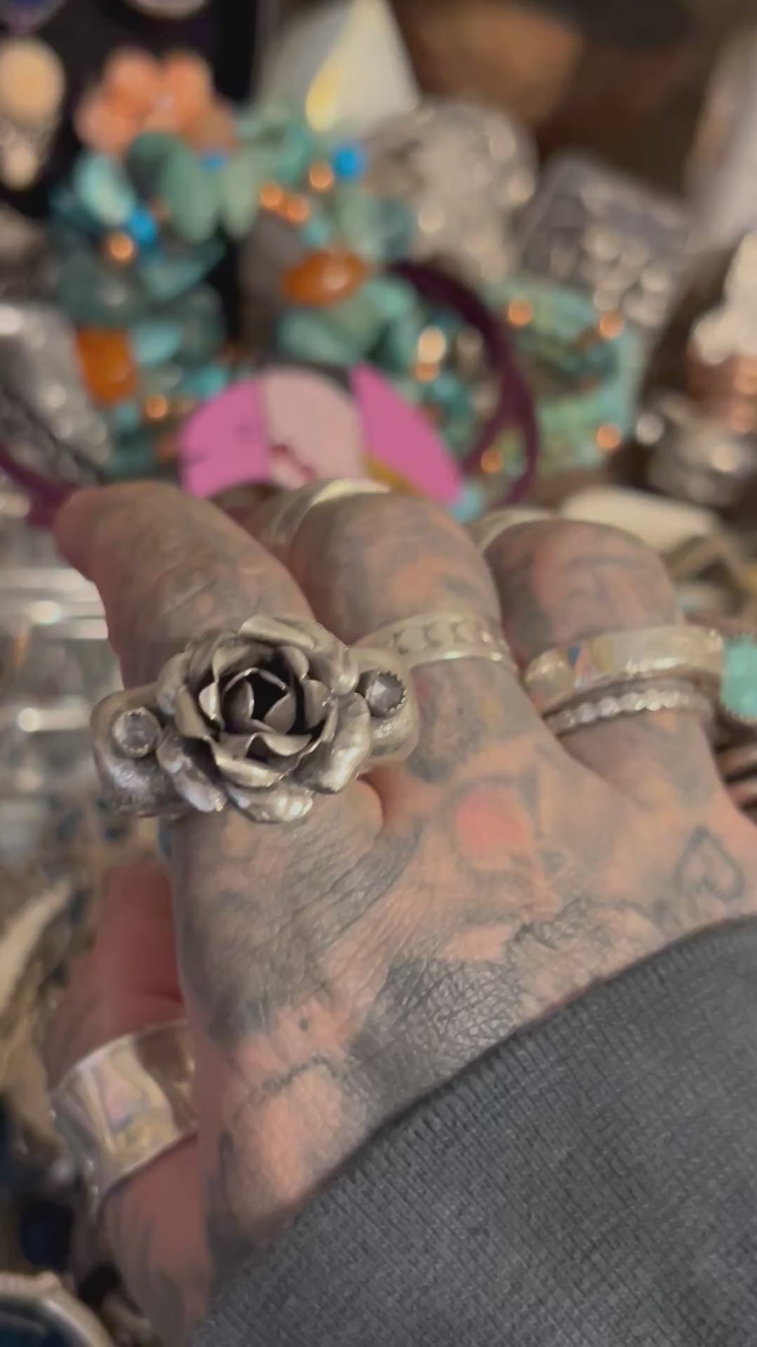 One of one handmade by Guz. Using recycled silver and a up-cycled Taxco rose from an old earring. Two small white topaz stones on each side.