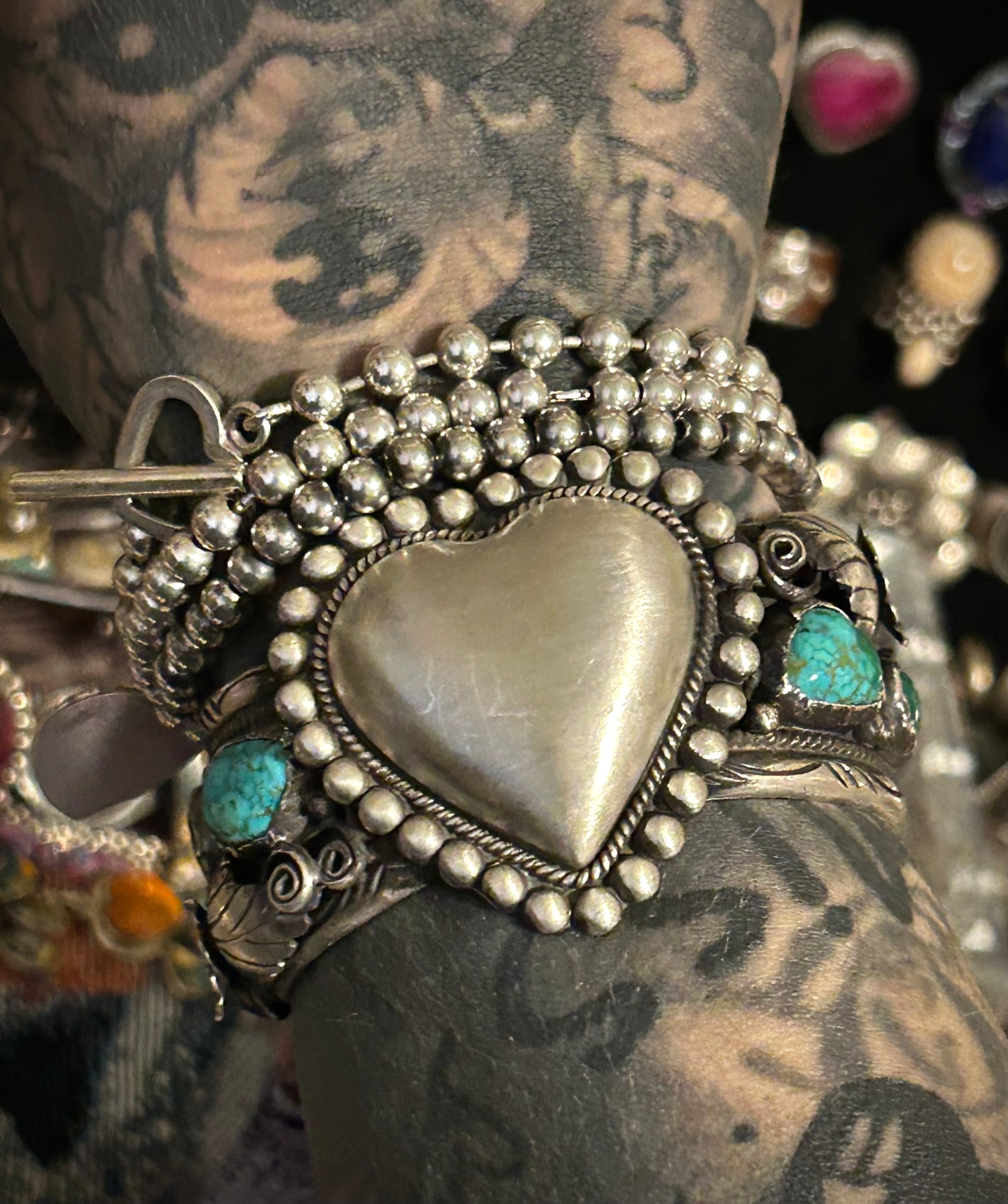 One of a kind piece up-cycled by Guz. Vintage native watch cuff & vintage Taxco heart pendant re-created into this one of a kind creation.