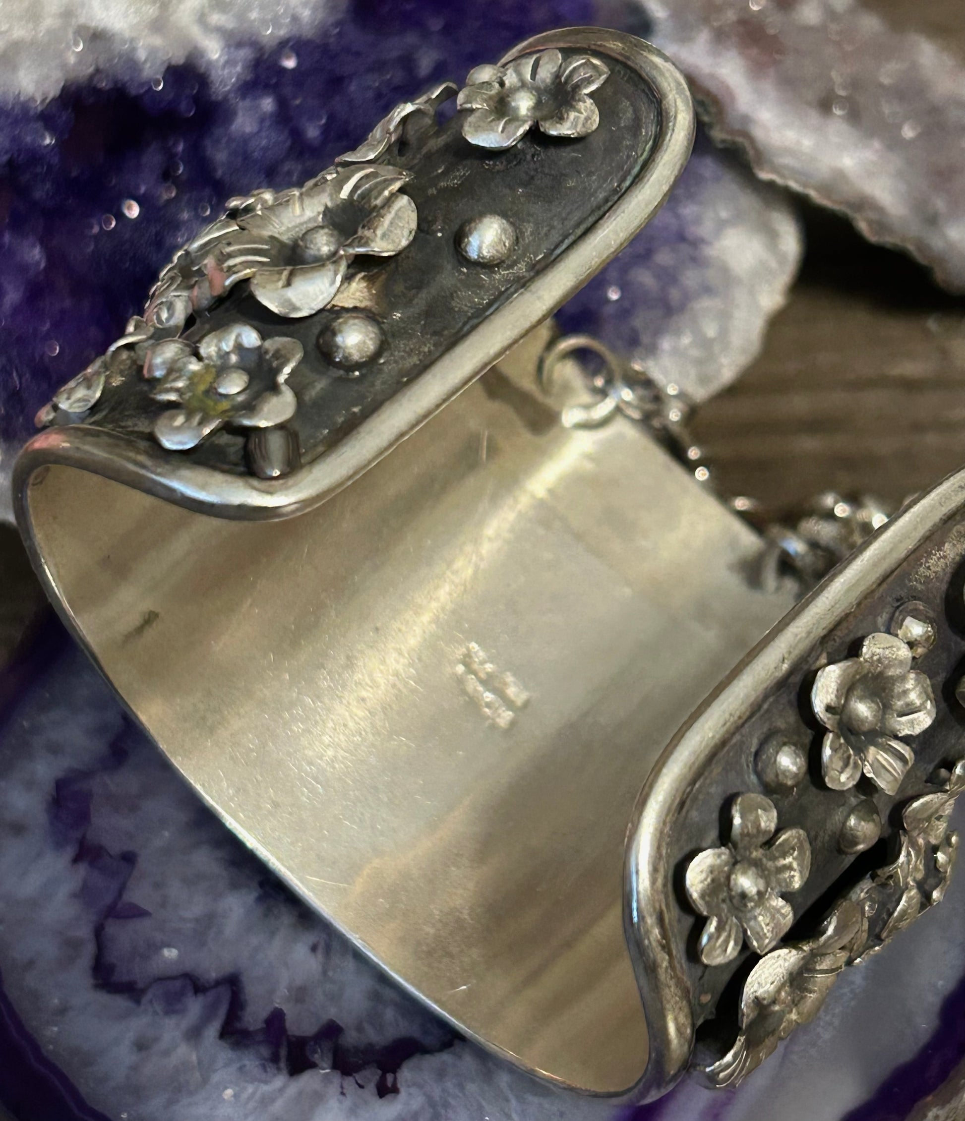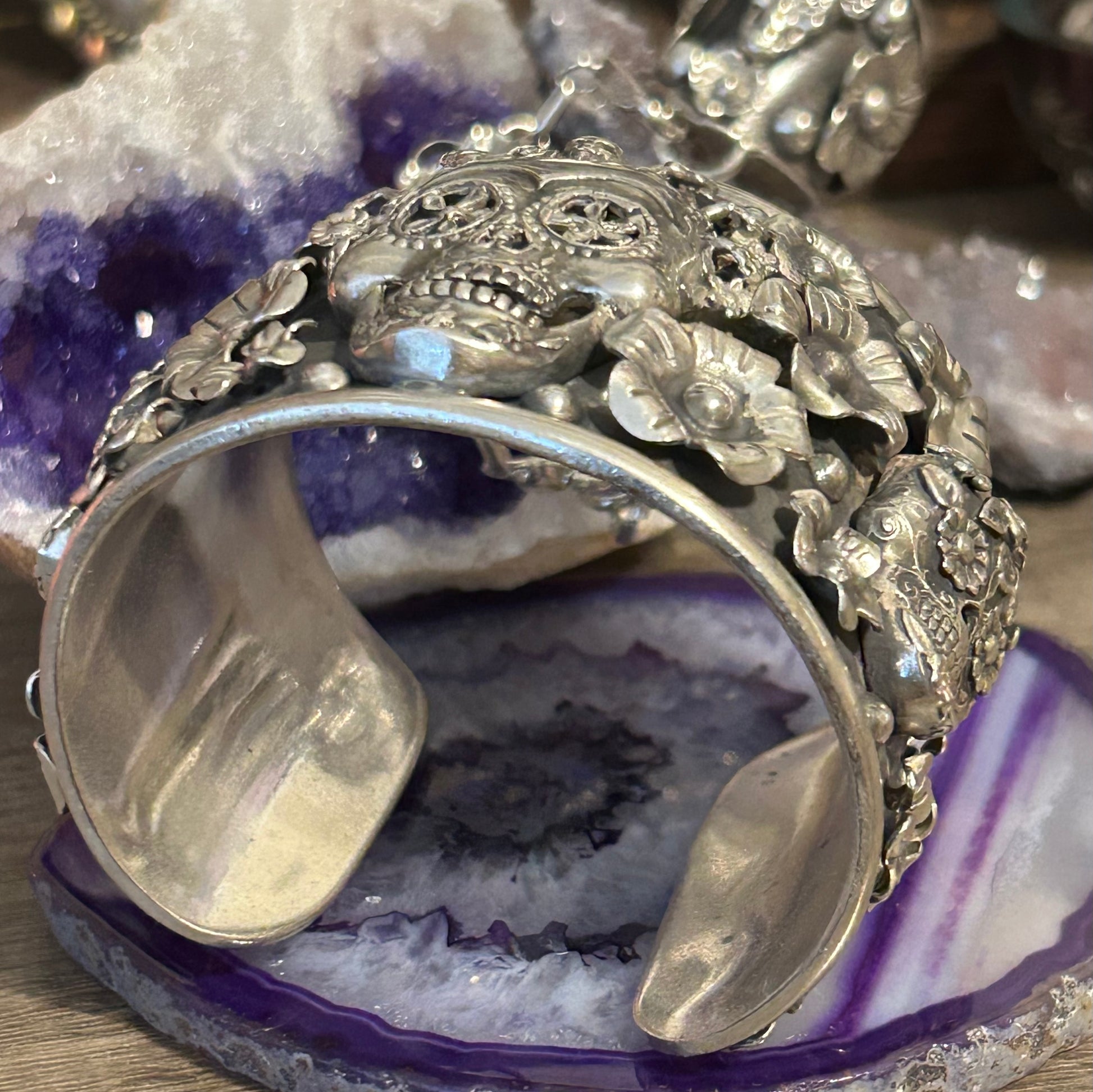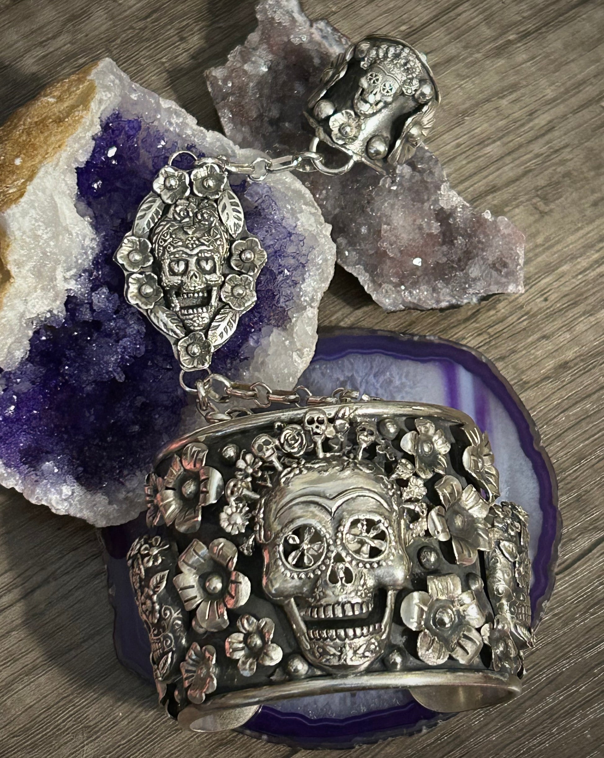 This ONE OF A KIND Taxco Day of the Dead hand-harness bracelet set was up-cycled and put together by Guz out of three different taxco pieces and re-created into this one of a kind piece of art!