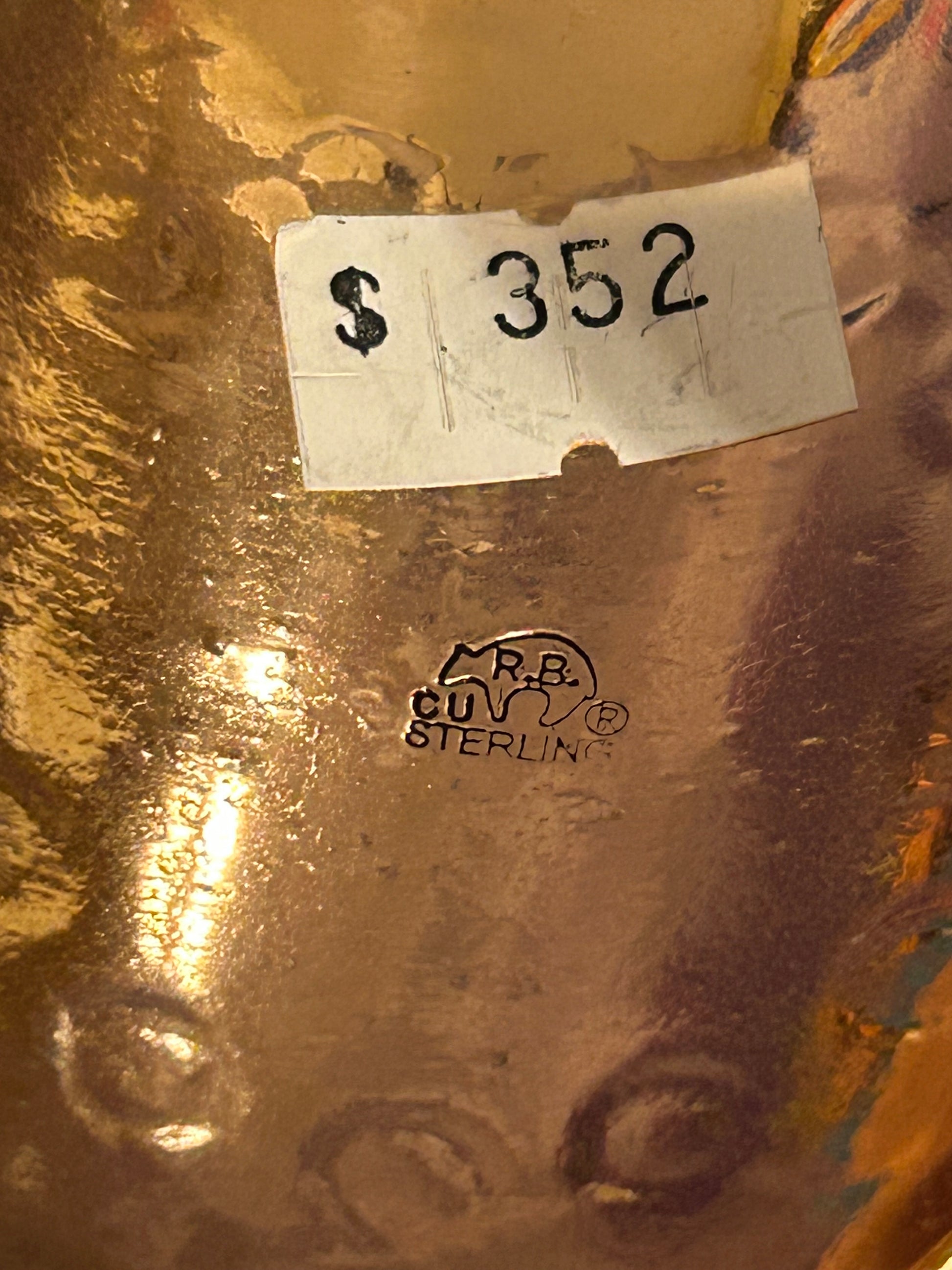 Gorgeous Copper & Sterling silver cuff by Running Bear. Natural turquoise and coral stones. Nice thick cuff so there is not alot of flex to it. It will fit best wrist sizes 6.25-6.5. It’s in amazing condition and doesn’t seam to ever have been worn. Carefully sourced and curated by Guz. |