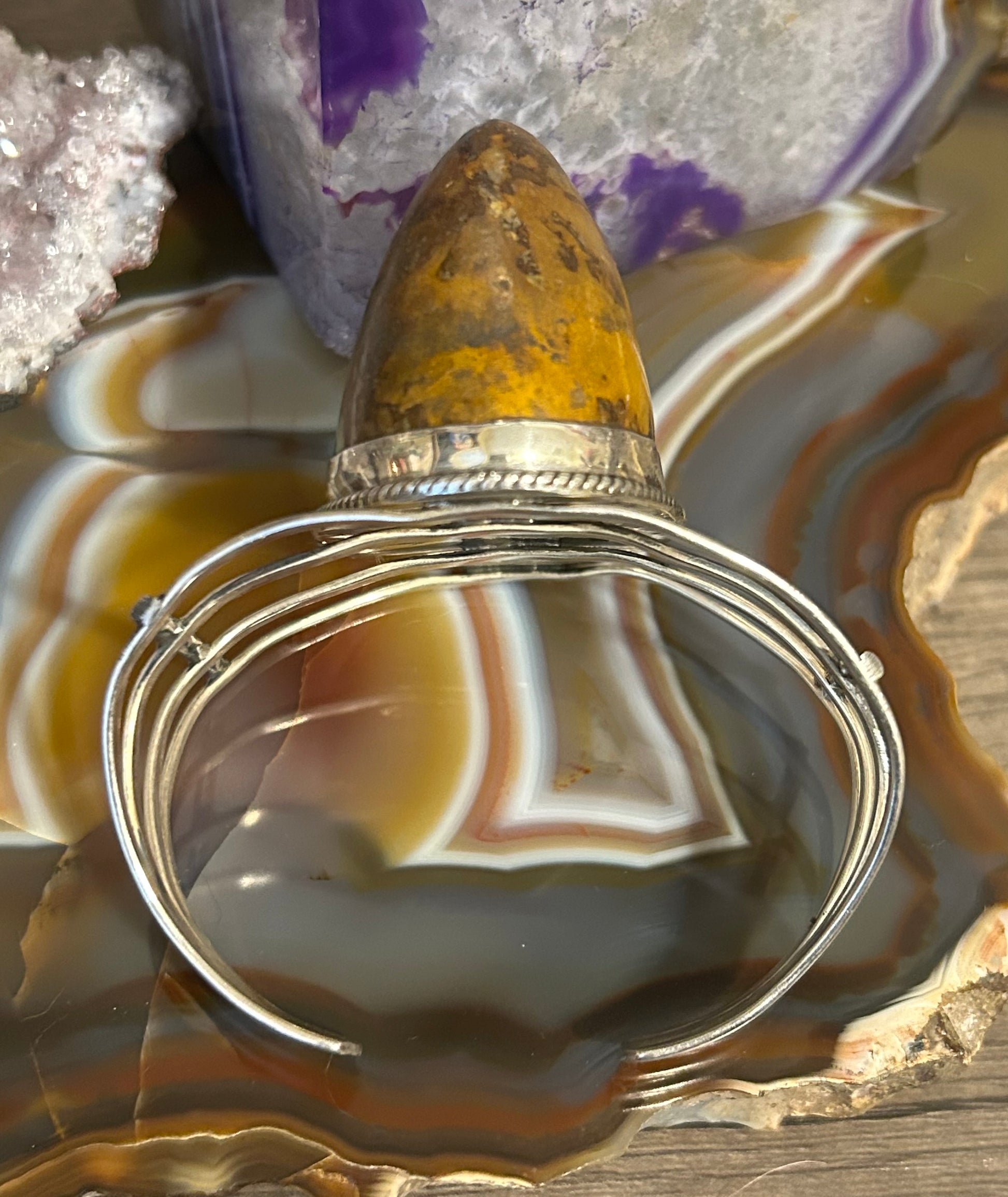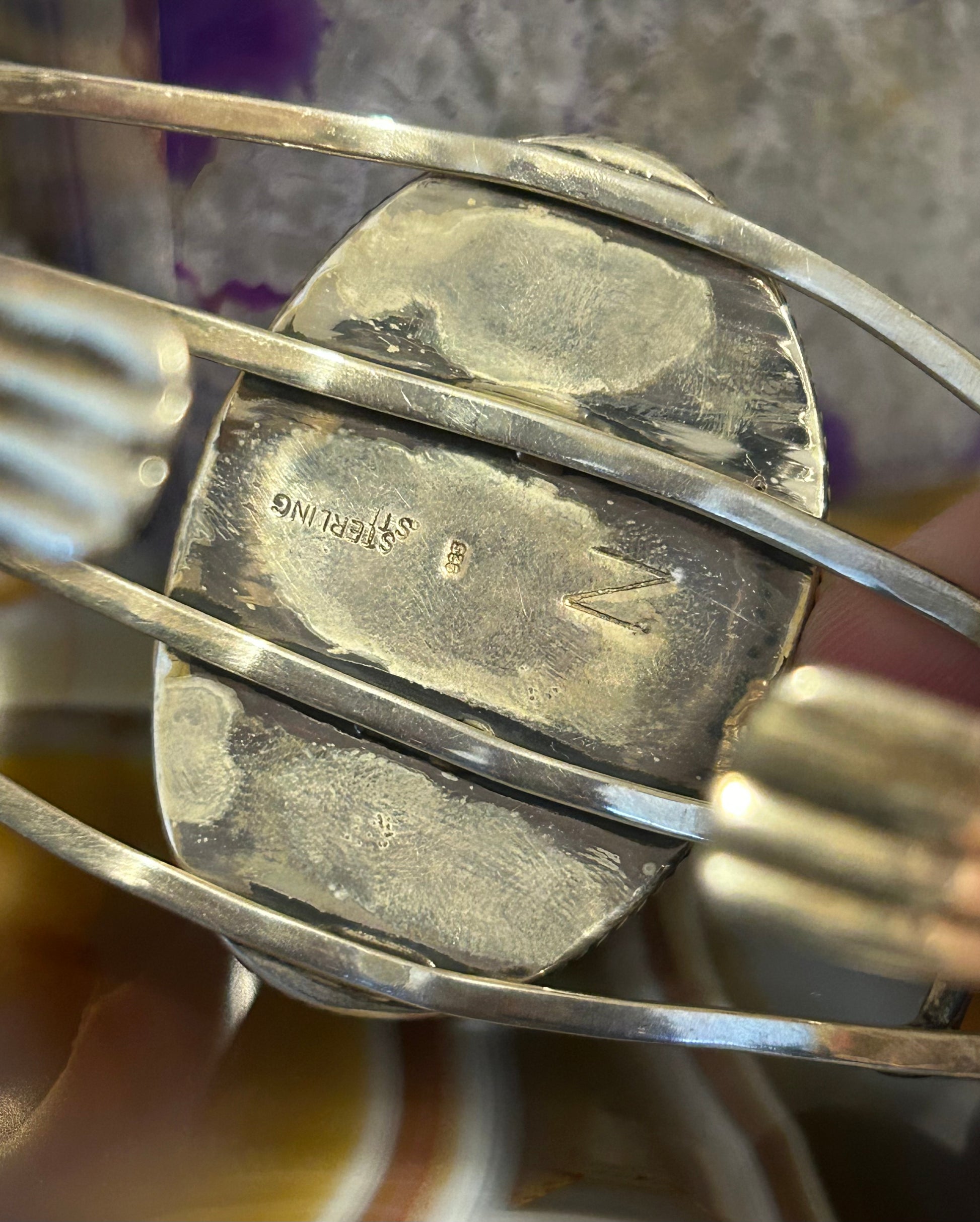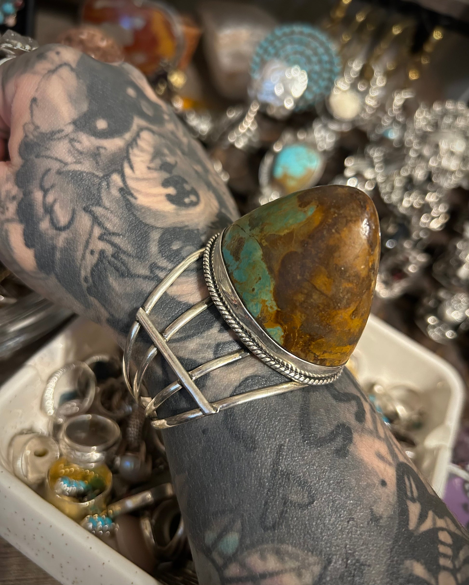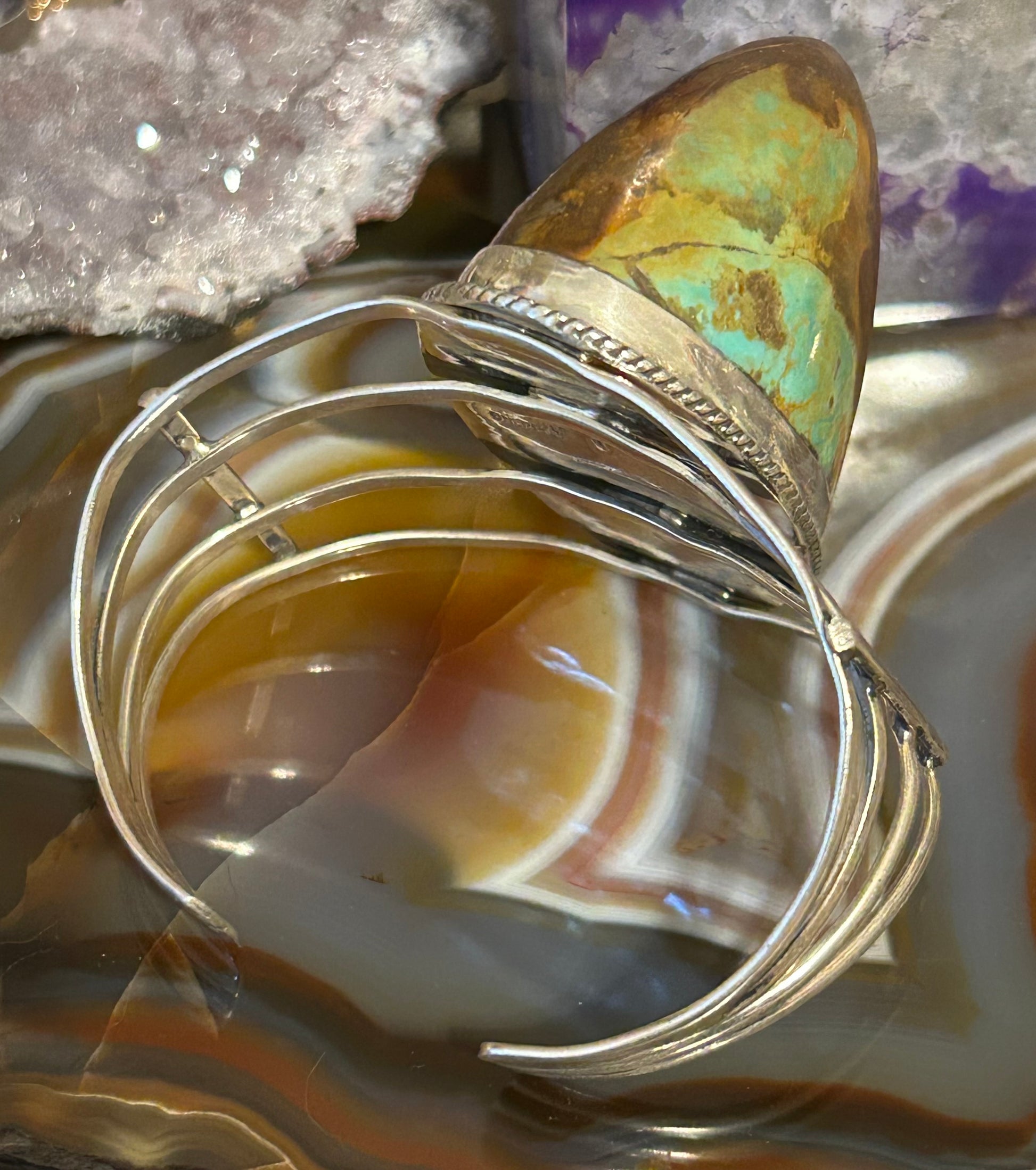 Unique large natural turquoise stone set in sterling silver!! Cuff has flex and can be adjusted. Fits best 6.5-8 inches. If you’re looking for a unique one of a kind statement piece this is it! Pre loved but in excellent shape. |