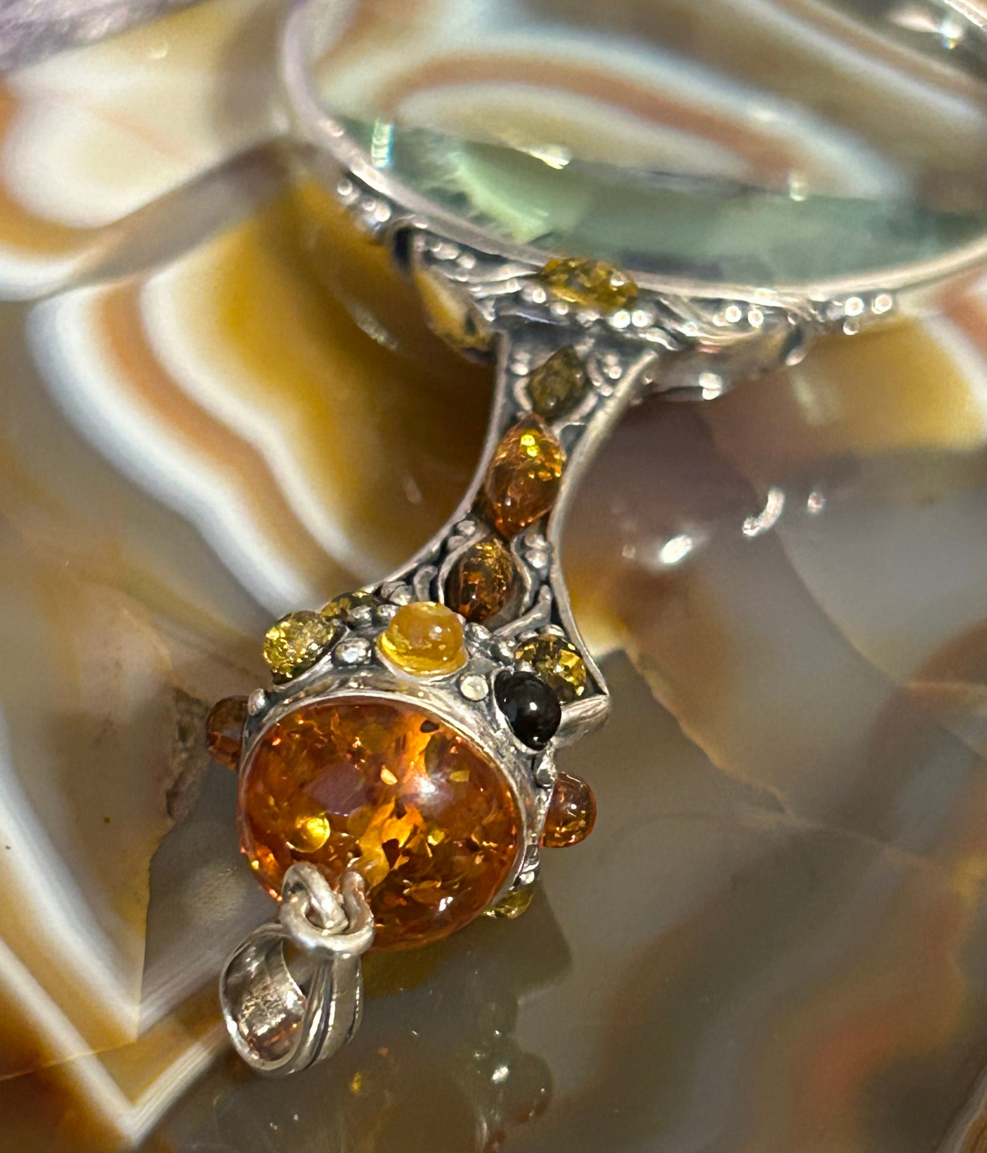 Gorgeous unique sterling silver magnify glass pendant with genuine Baltic ambers through out it.