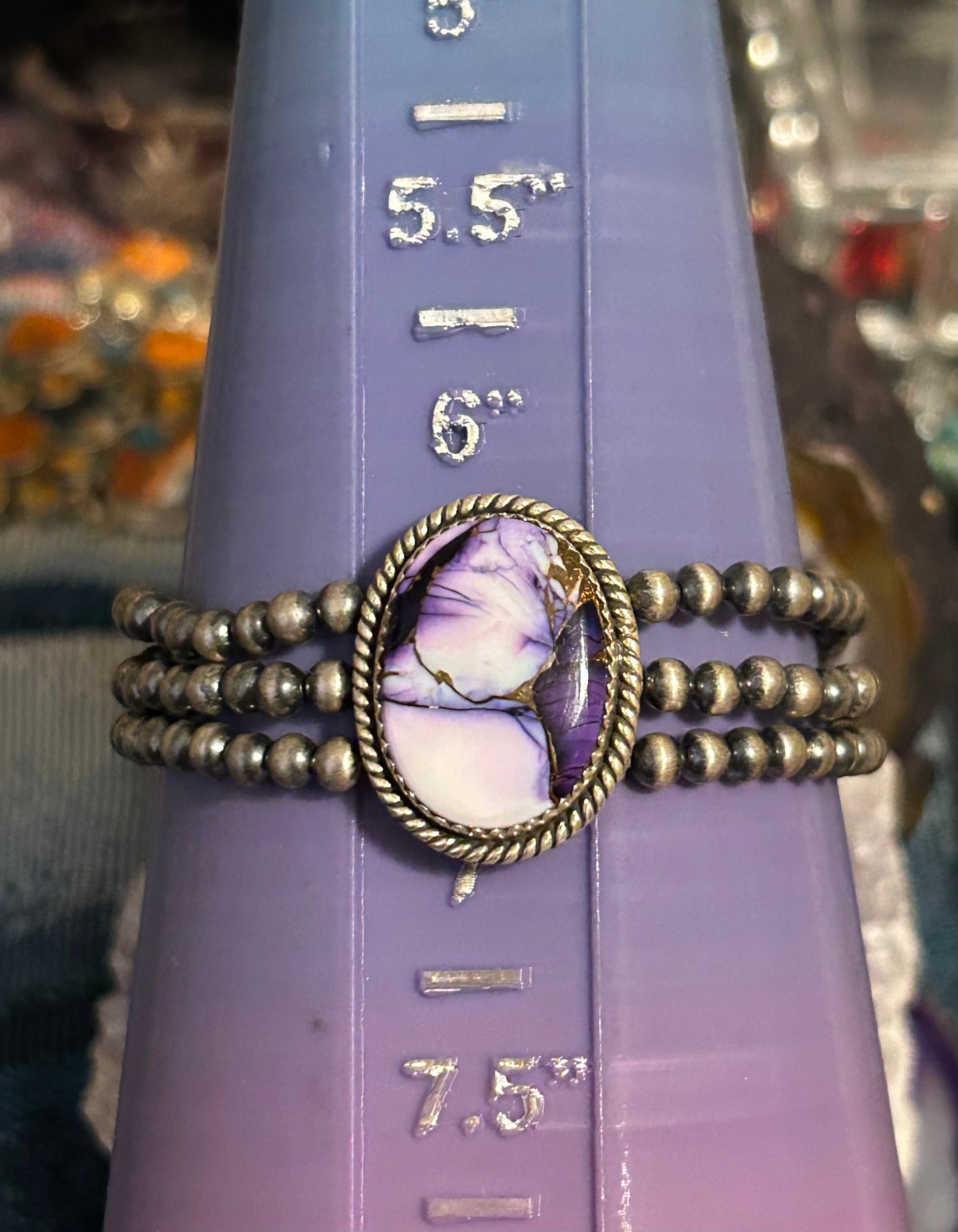 Gorgeous triple beaded band stretch bracelet with violet dahlia stone. All sterling silver! These are sterling beads with an oxidized artistic finish, they are NOT native made.