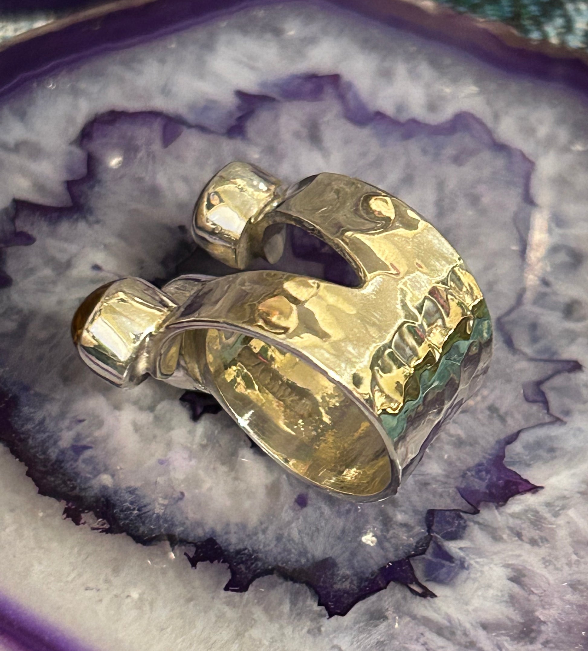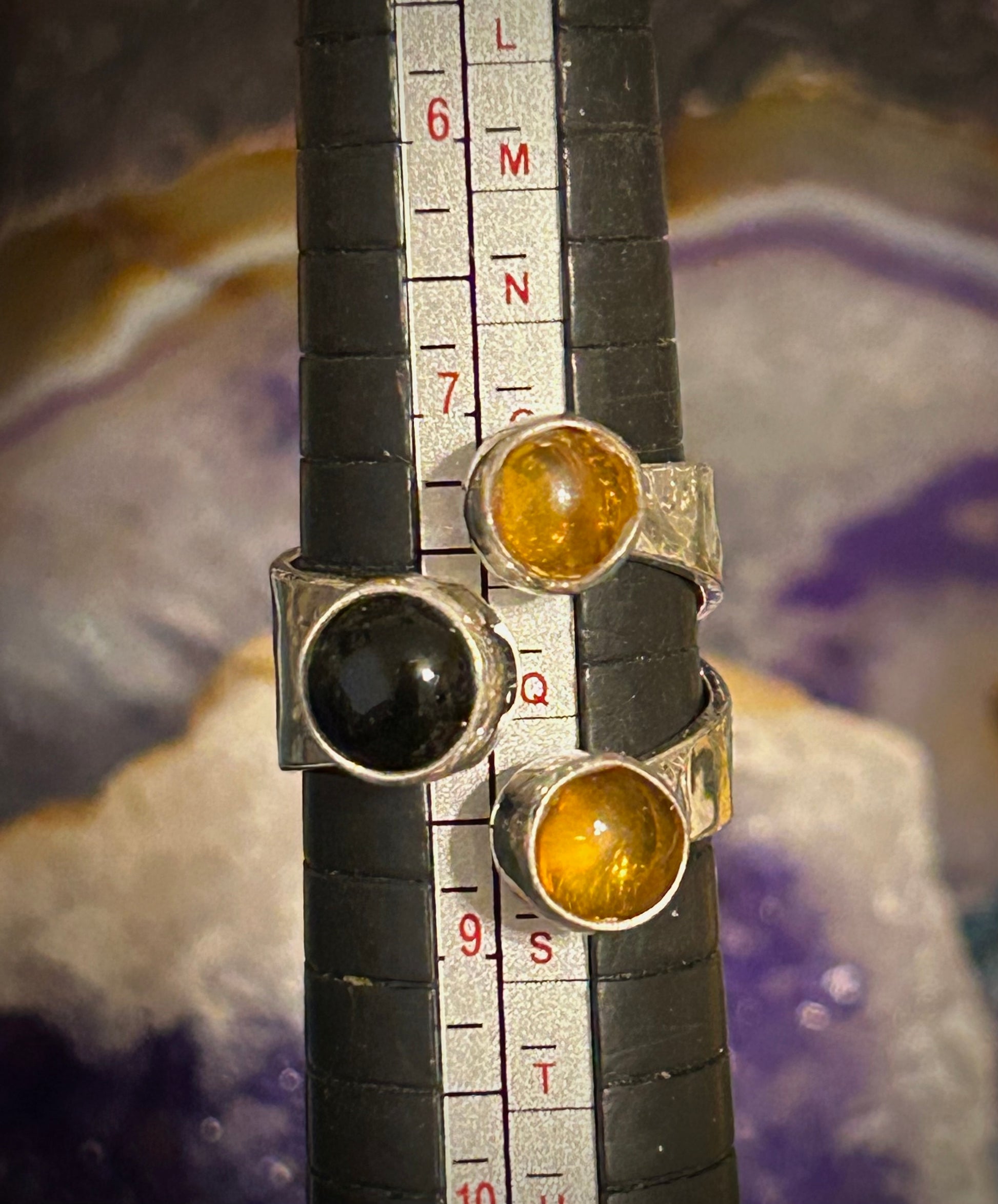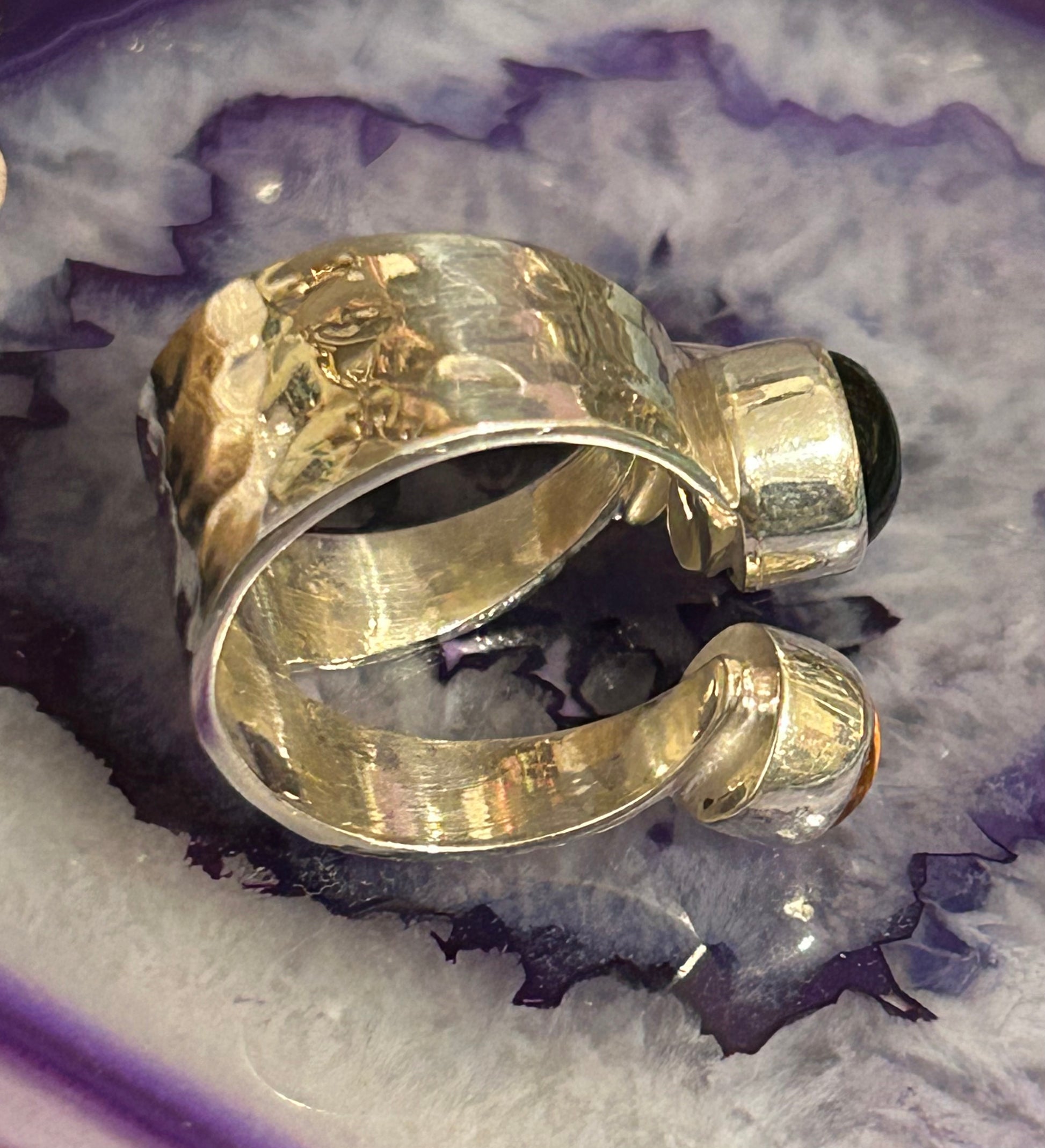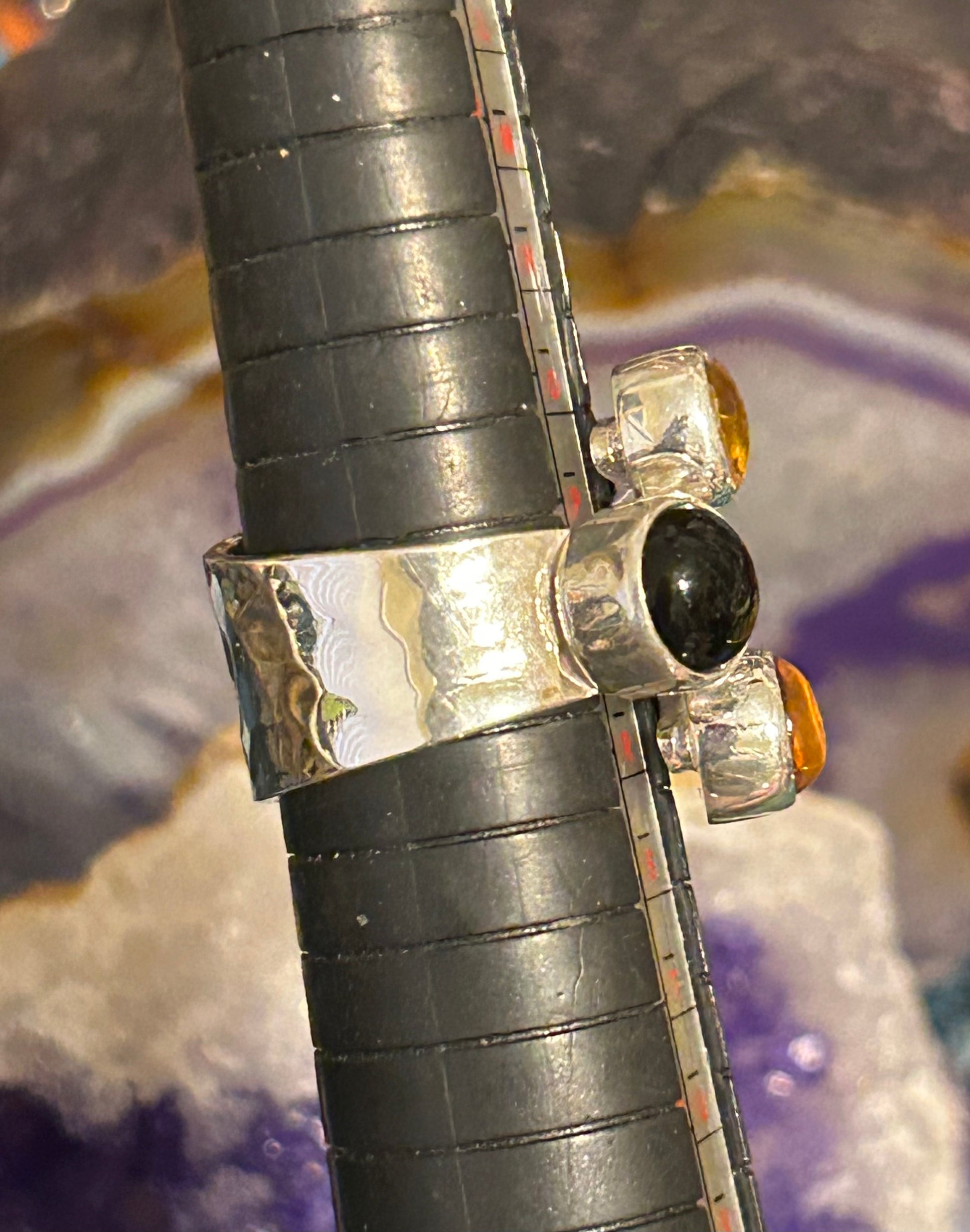Gorgeous Sterling silver bypass ring with natural onyx and amber stones. We work directly with the silversmiths who hand make these rings in Taxco, Mexico. Bypass ring that is adjustable best sizes 7-8. Nice sturdy hammered band. Please review all photos. |