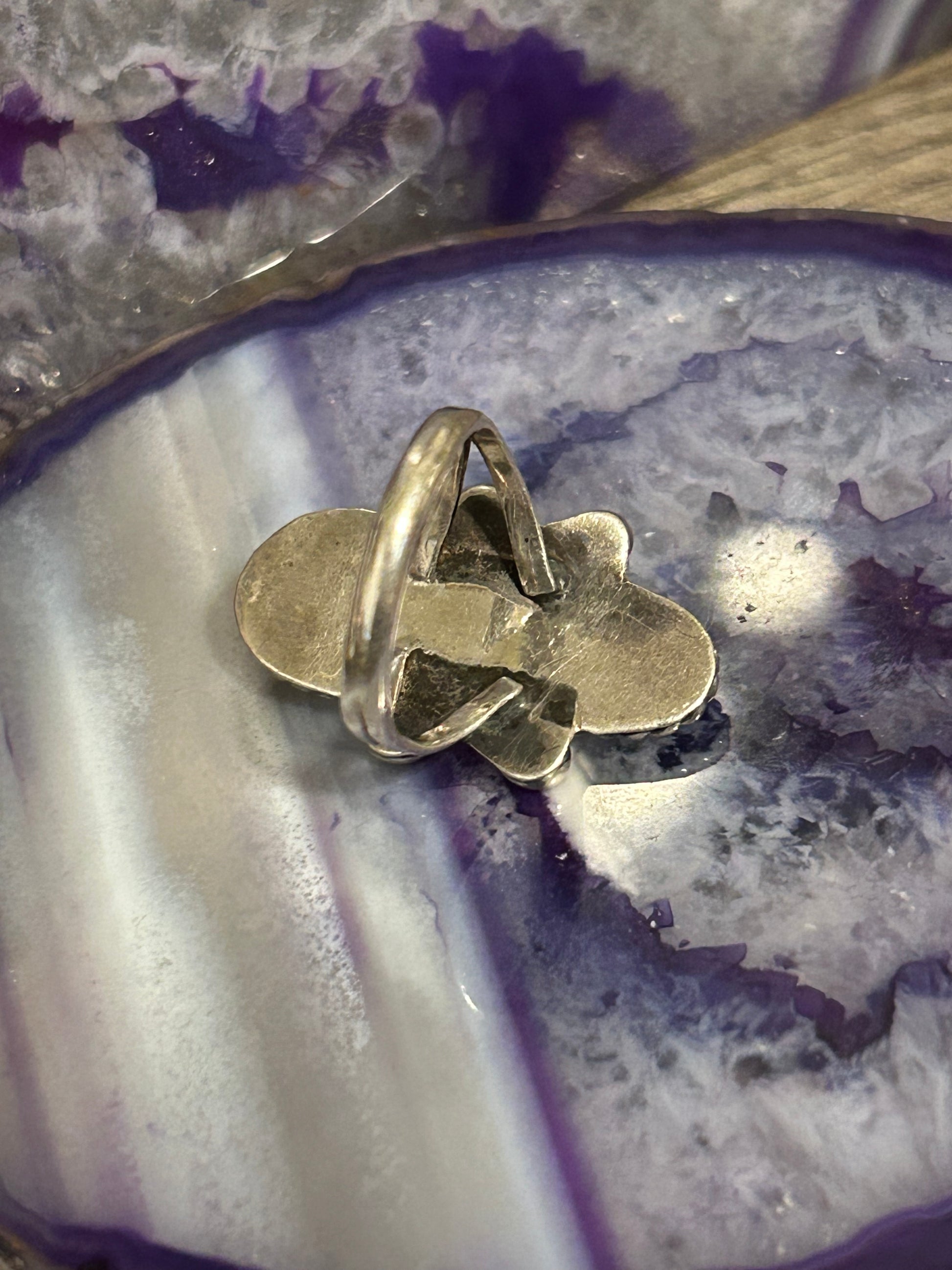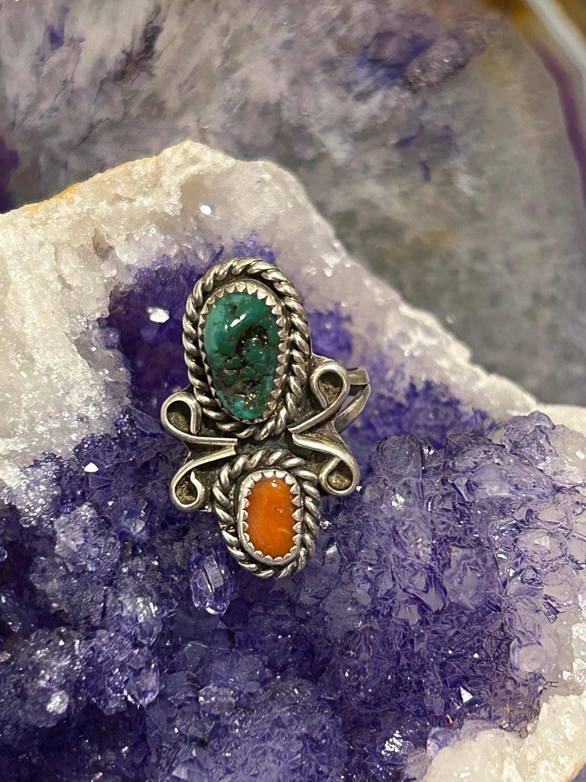 Gorgeous vintage Native American made ring with turquoise and coral stones. Size 5.