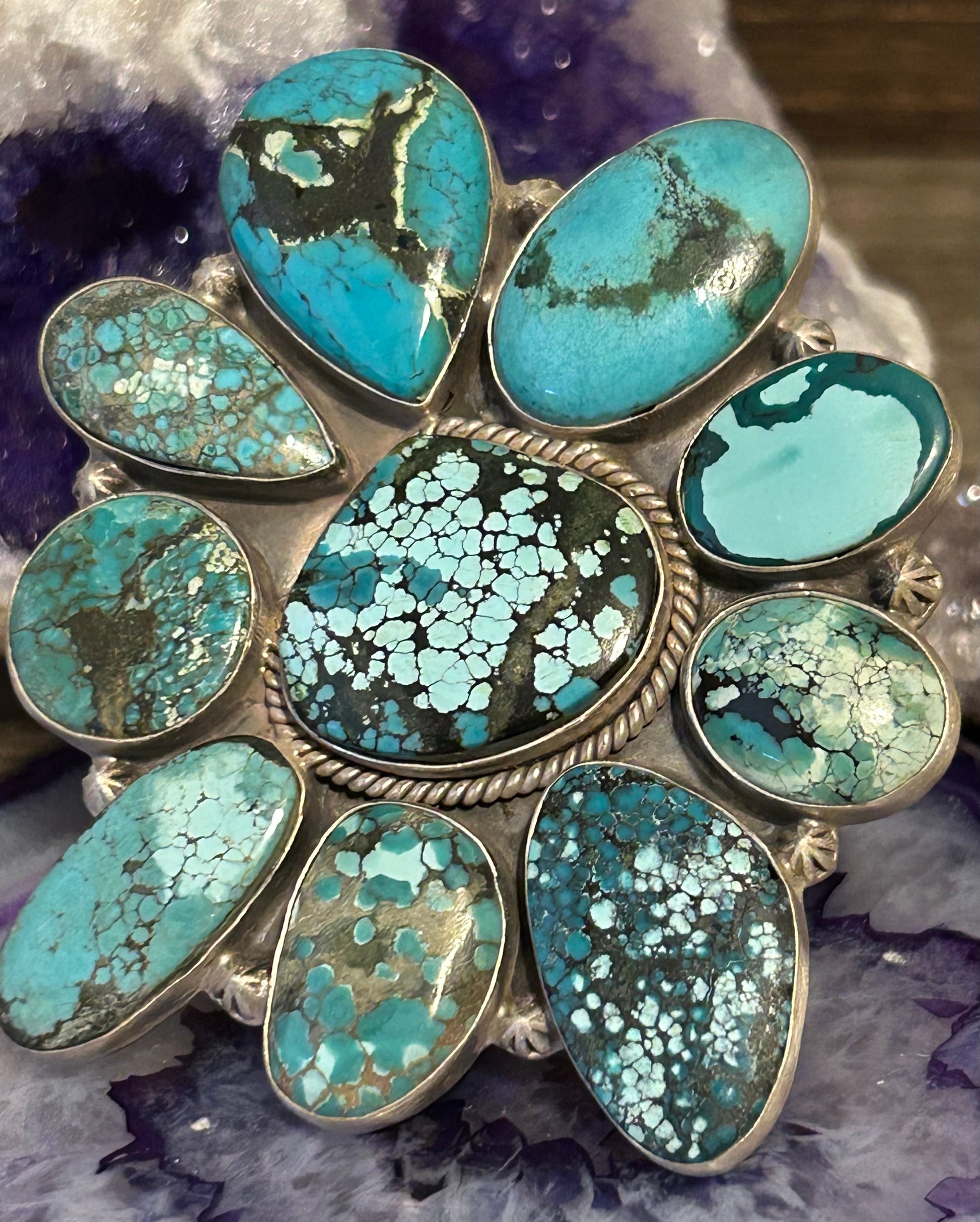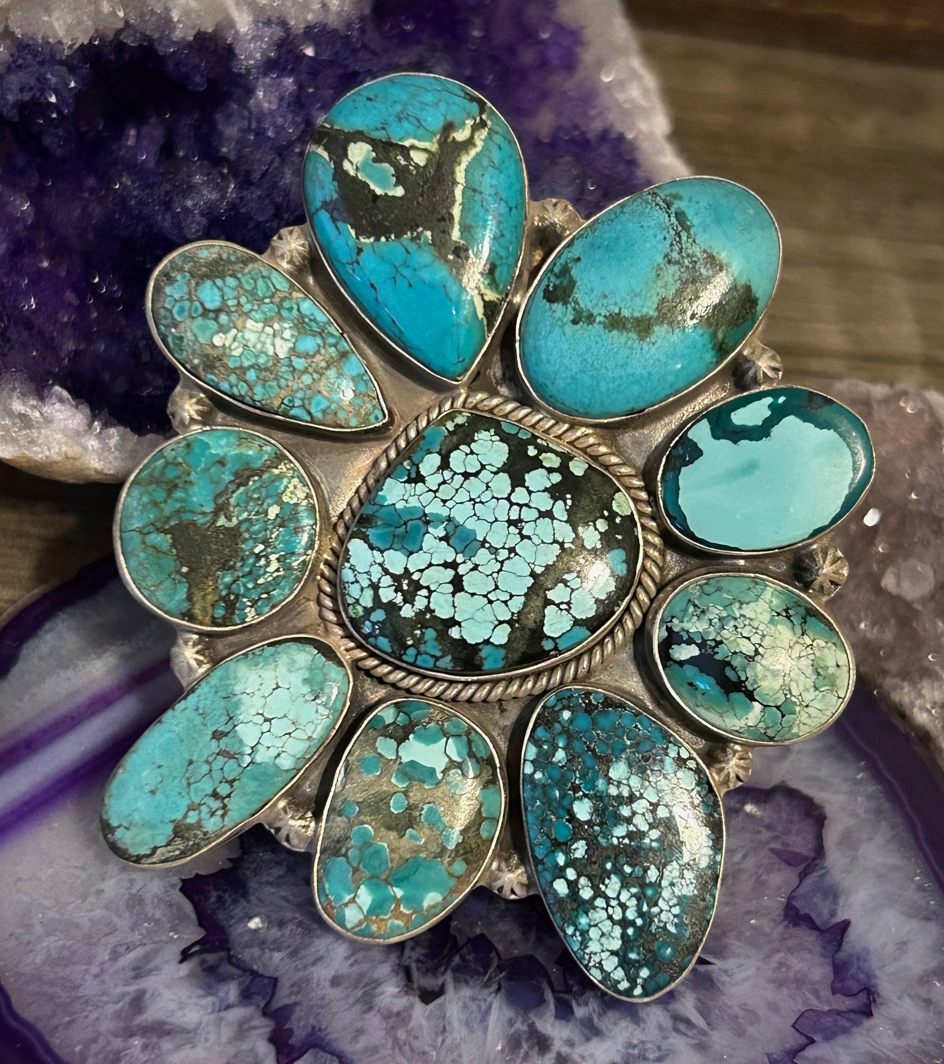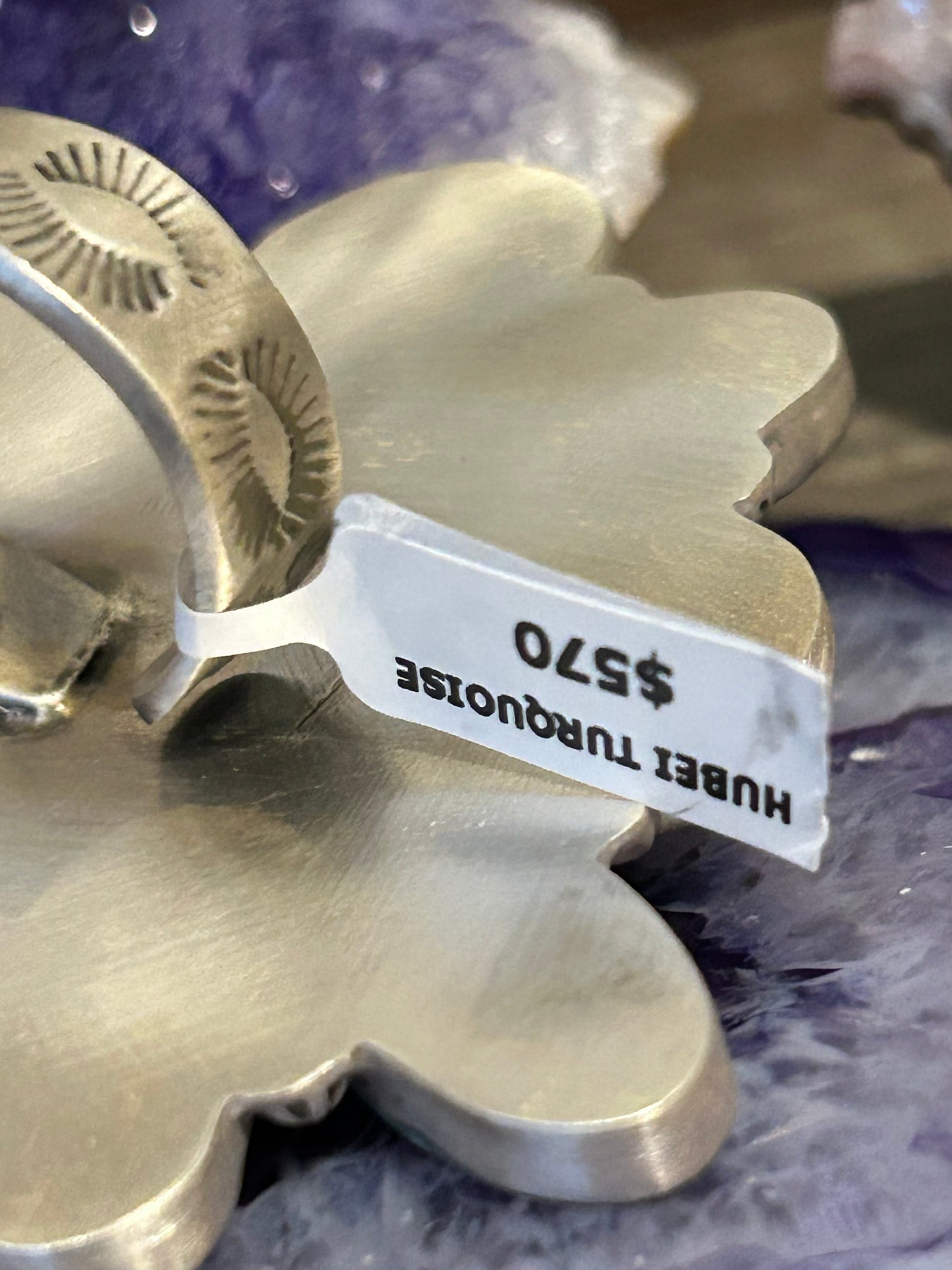 Huge statement ring! With natural Hubei turquoise stones. All 925 sterling silver with closed back ring. Gorgeous thick adjustable band that has beautiful stamp work on it and fits best sizes 10 and under. Carefully sourced and curated by Guz. |