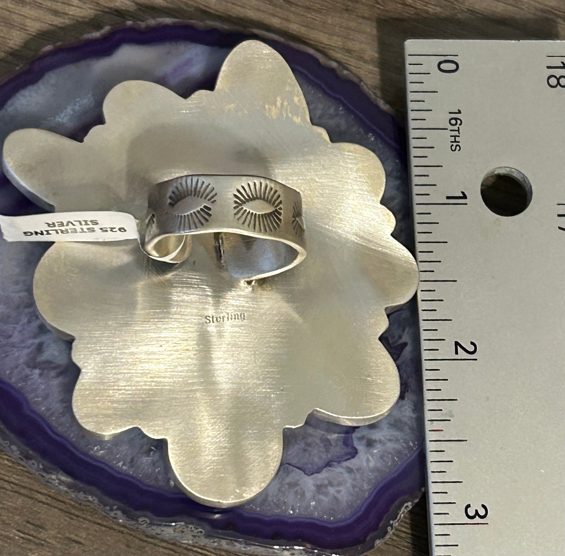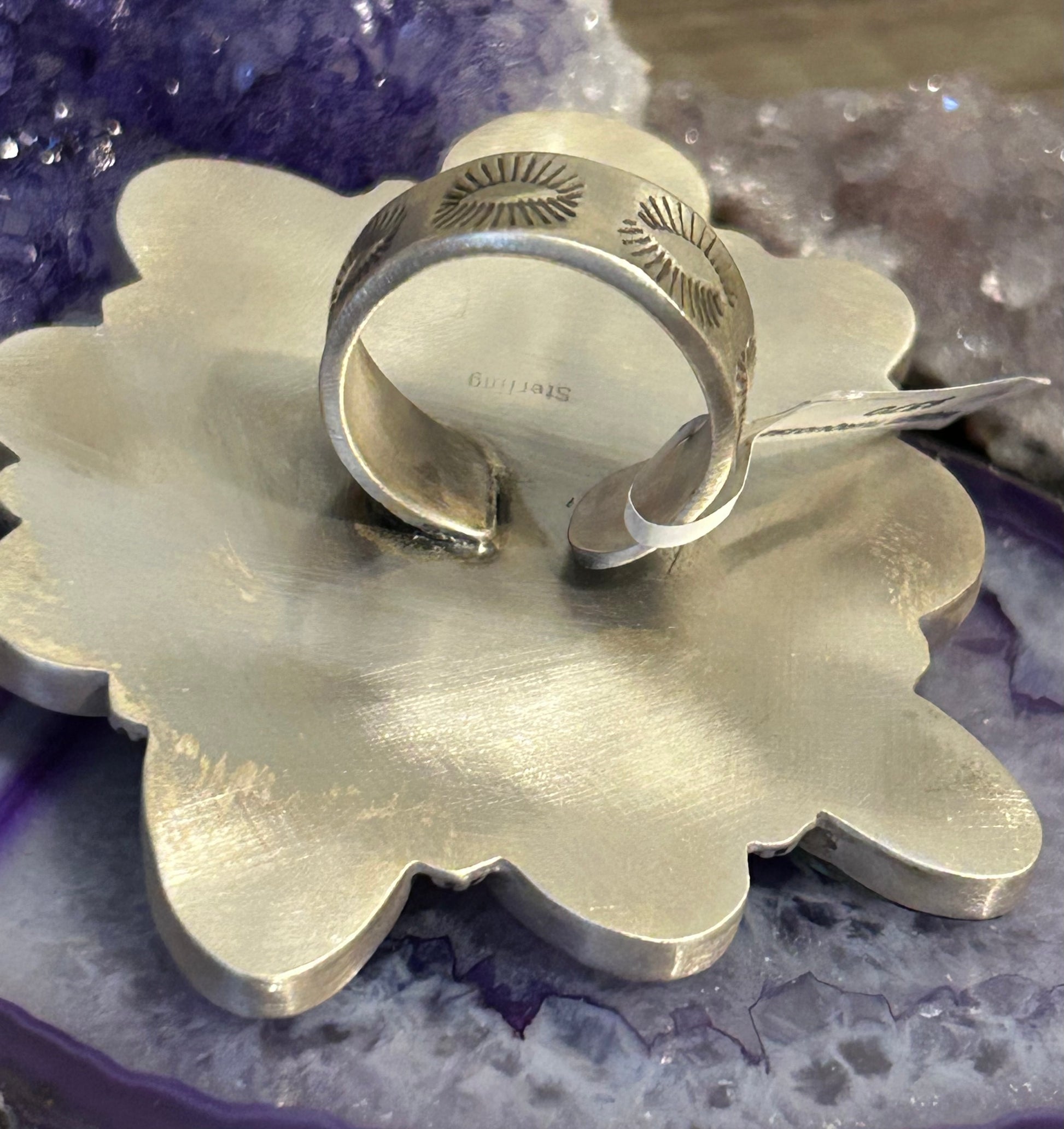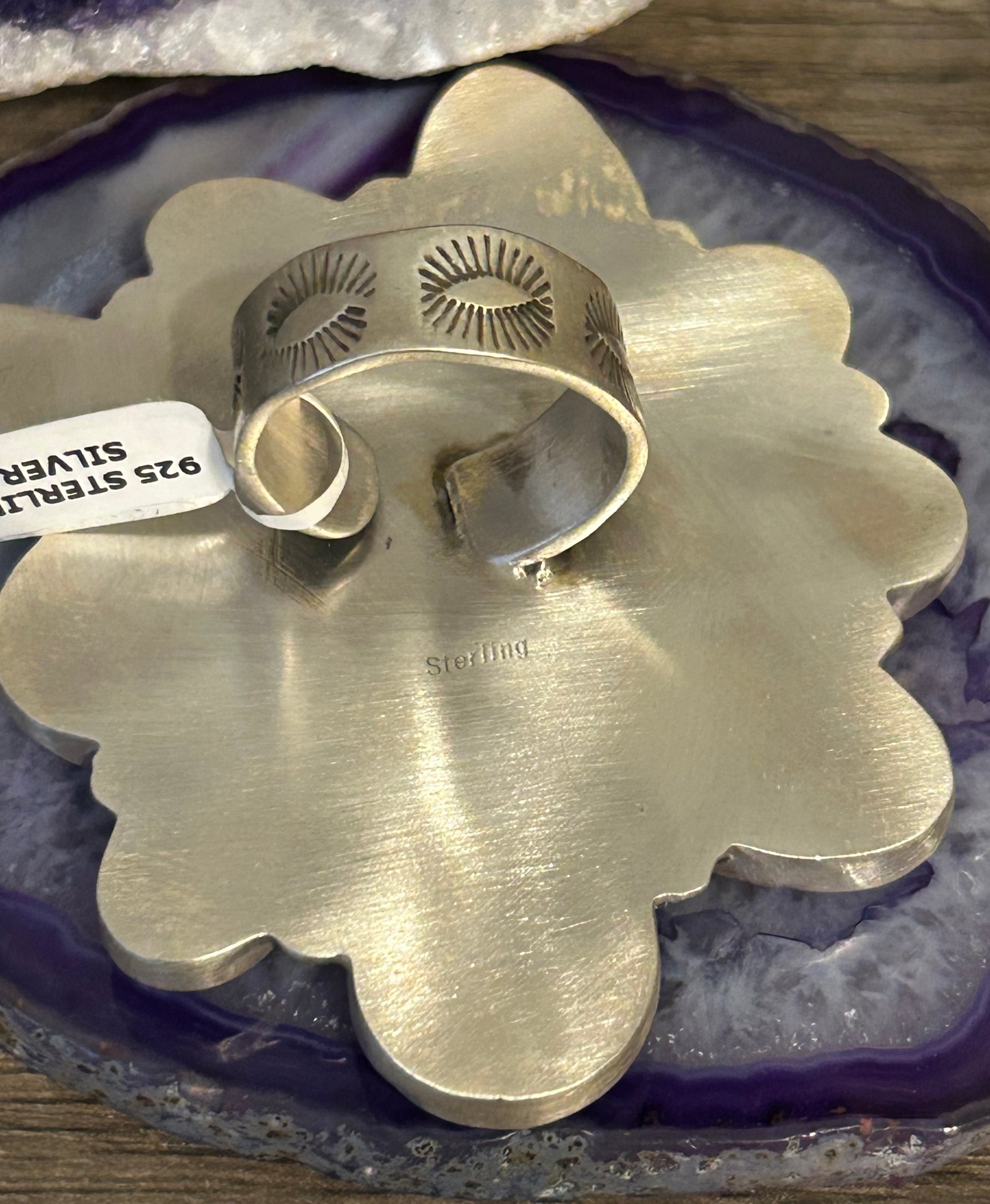 Huge statement ring! With natural Hubei turquoise stones. All 925 sterling silver with closed back ring. Gorgeous thick adjustable band that has beautiful stamp work on it and fits best sizes 10 and under. Carefully sourced and curated by Guz. |