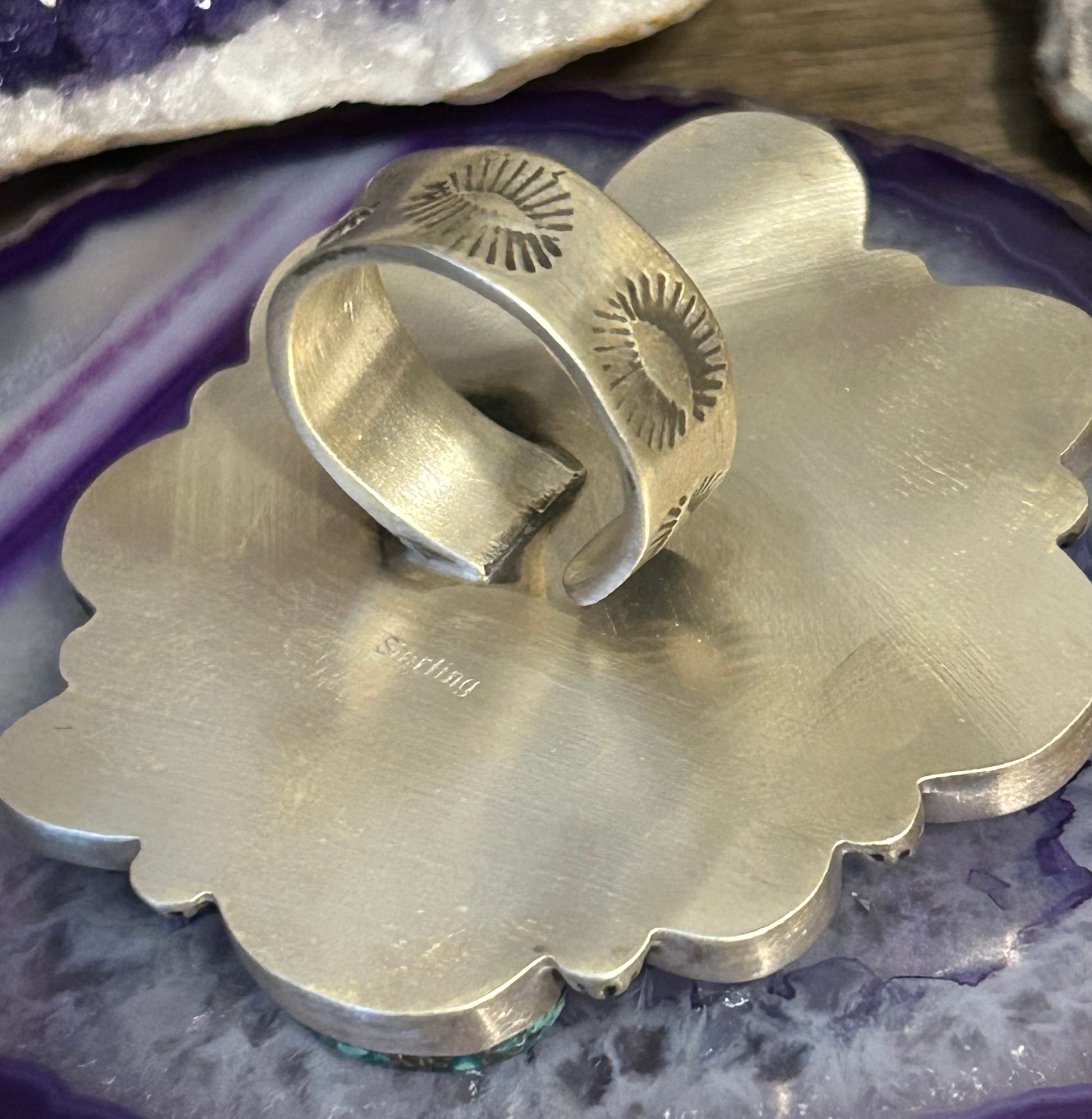 Huge statement ring! With natural Hubei turquoise stones. All 925 sterling silver with close back ring. Gorgeous thick adjustable band that has beautiful stamp work on it and fits best sizes 10 and under. Carefully sourced and curated by Guz. |