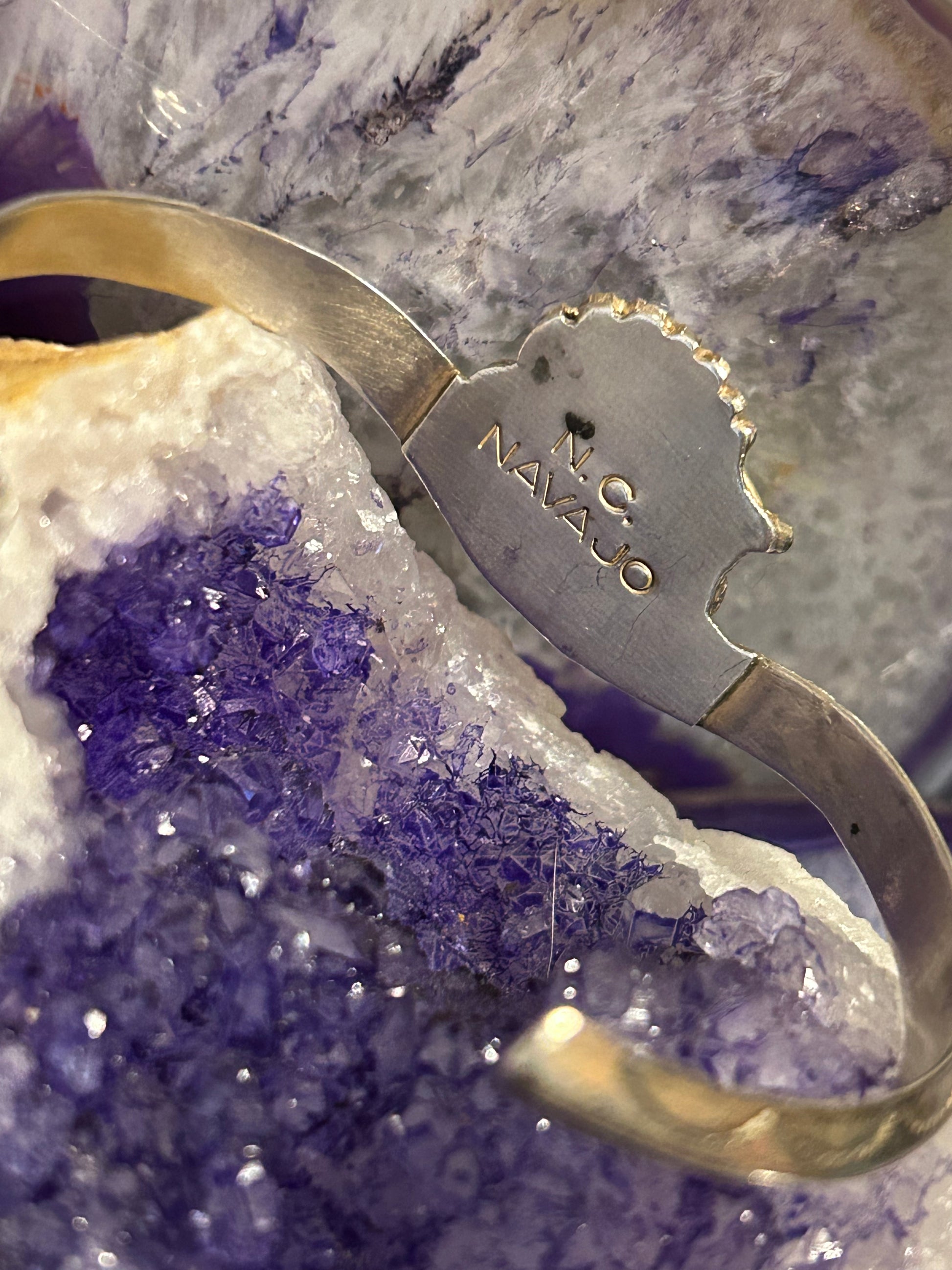 Gorgeous Sterling silver Navajo estate piece. 925 tested. It also has signature stamp. Beautiful stamp work on the cuff with a beautiful natural turquoise stone.