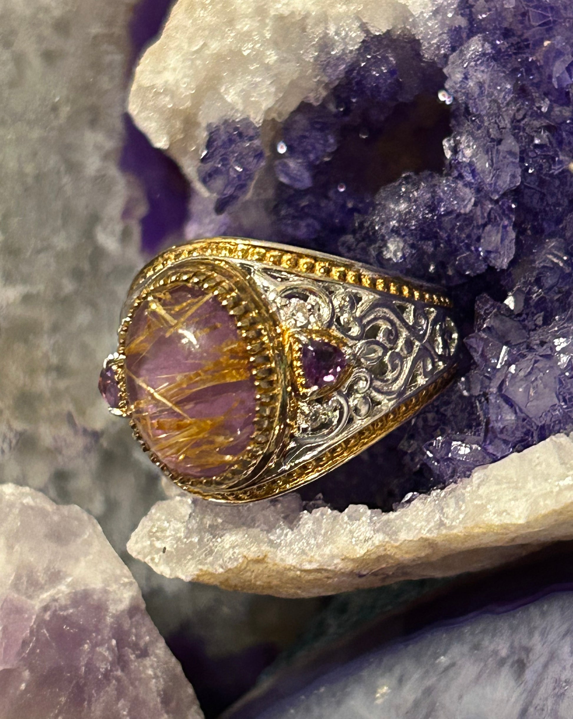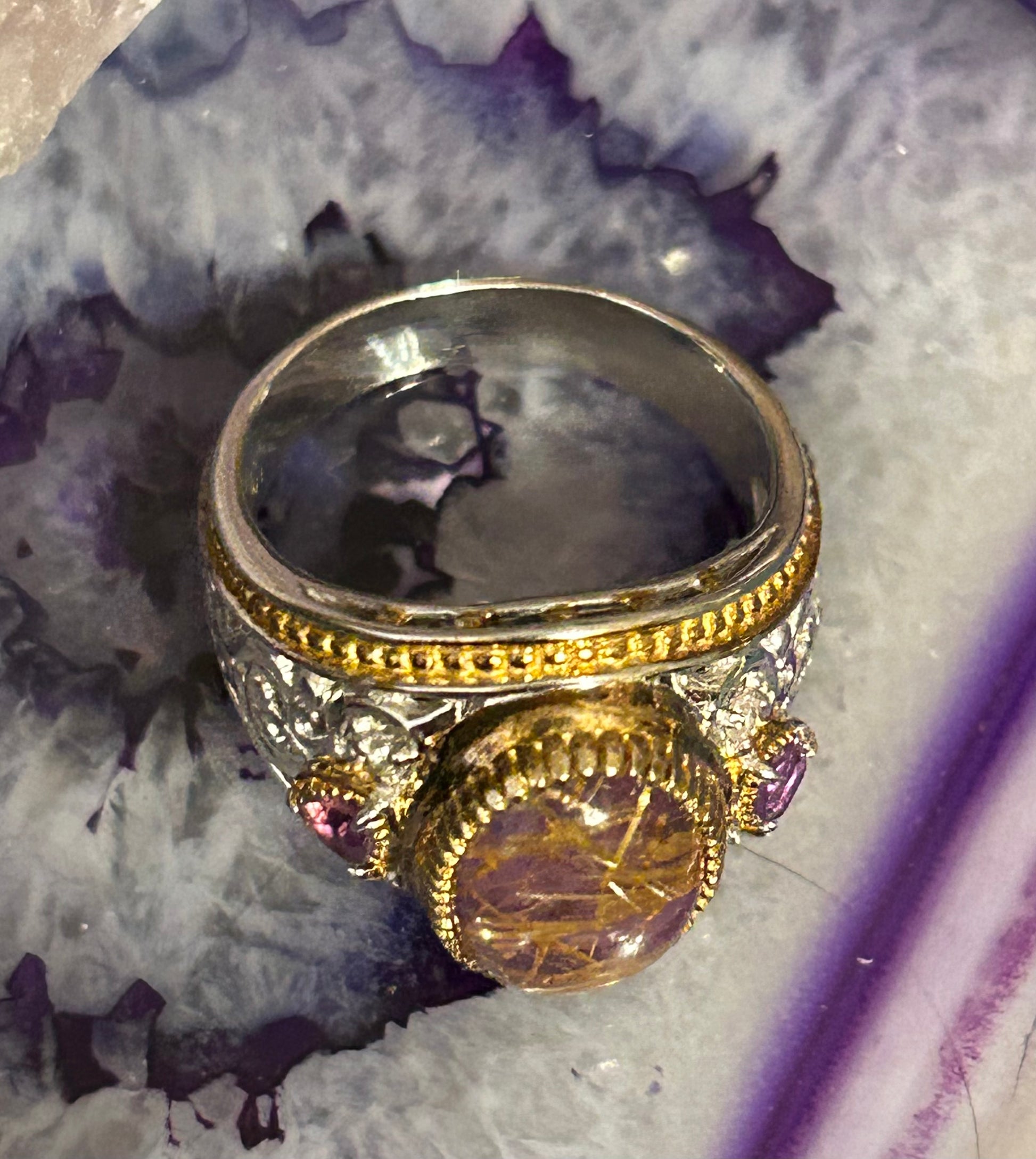 Gorgeous Sterling silver tested designer ring. Beautiful unique purple rutilated quartz with amethyst stones and gold over accents.