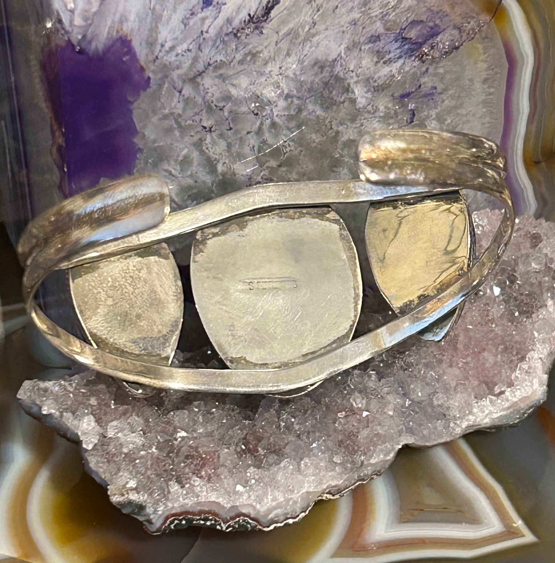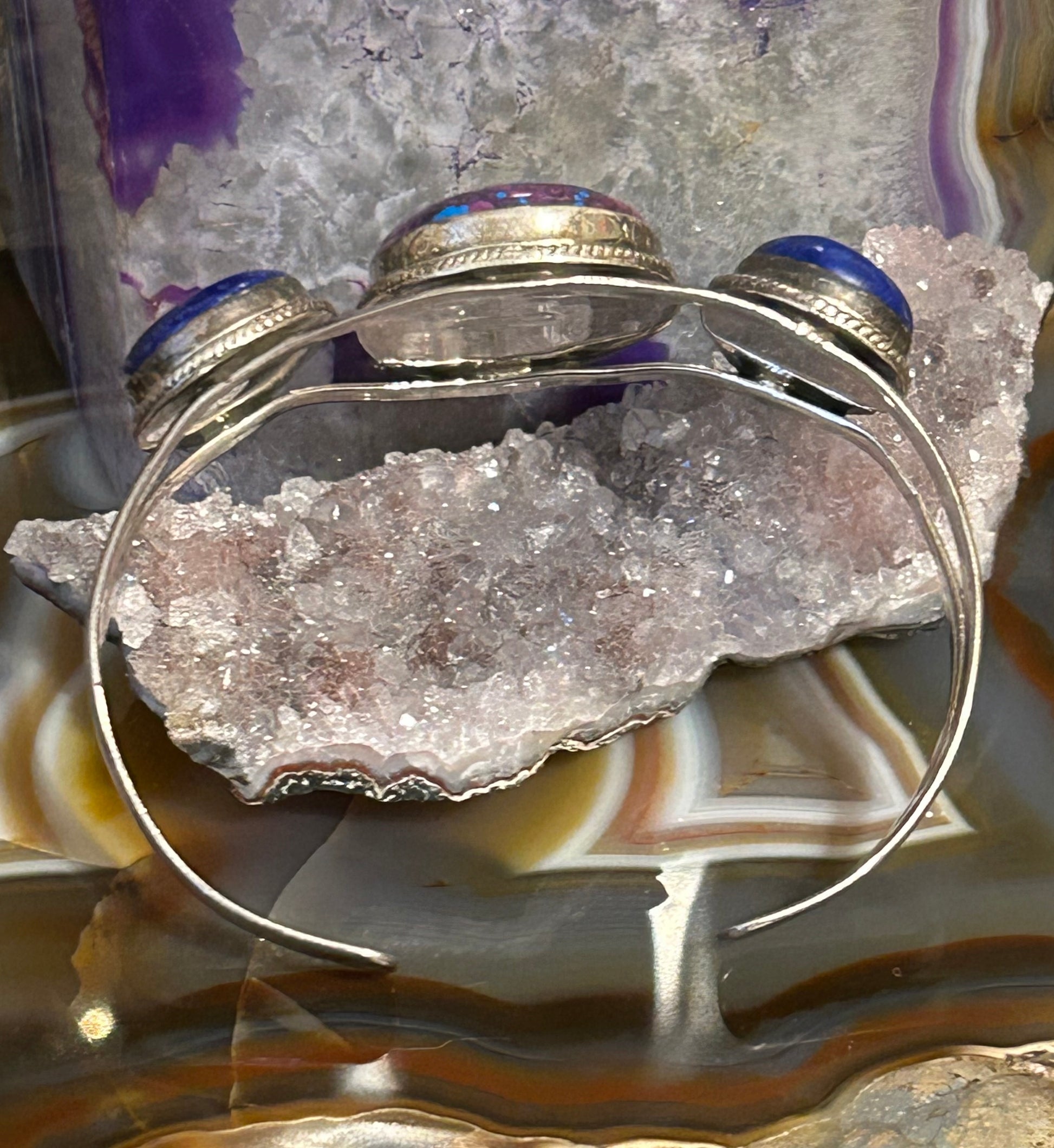 Gorgeous Sterling silver cuff bracelet with natural blue lapis stones and the center face stone is some kind of Mojave with beautiful colors. The cuff has flex to it so there is adjustability, fits best sizes 6.5-7.5. Carefully sourced and curated by Guz. |