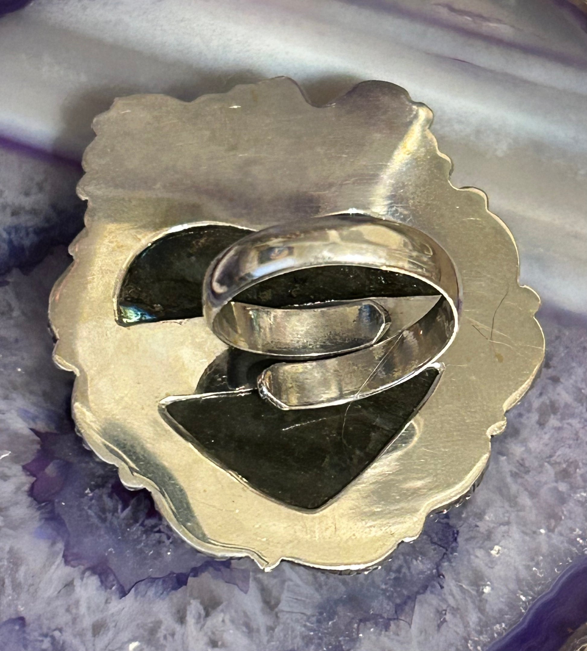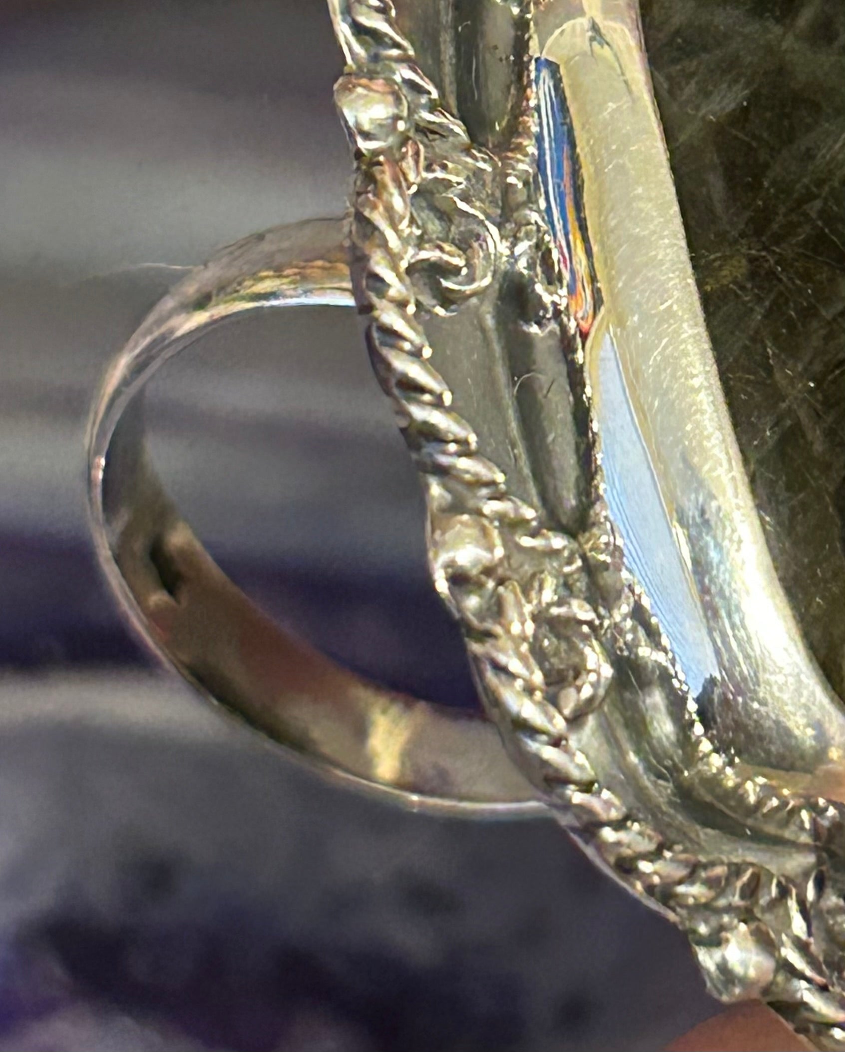 Huge natural labradorite stone set in sterling silver with beautiful designs around the stone. Comfy adjustable band that fits most sizes. Review all photos.