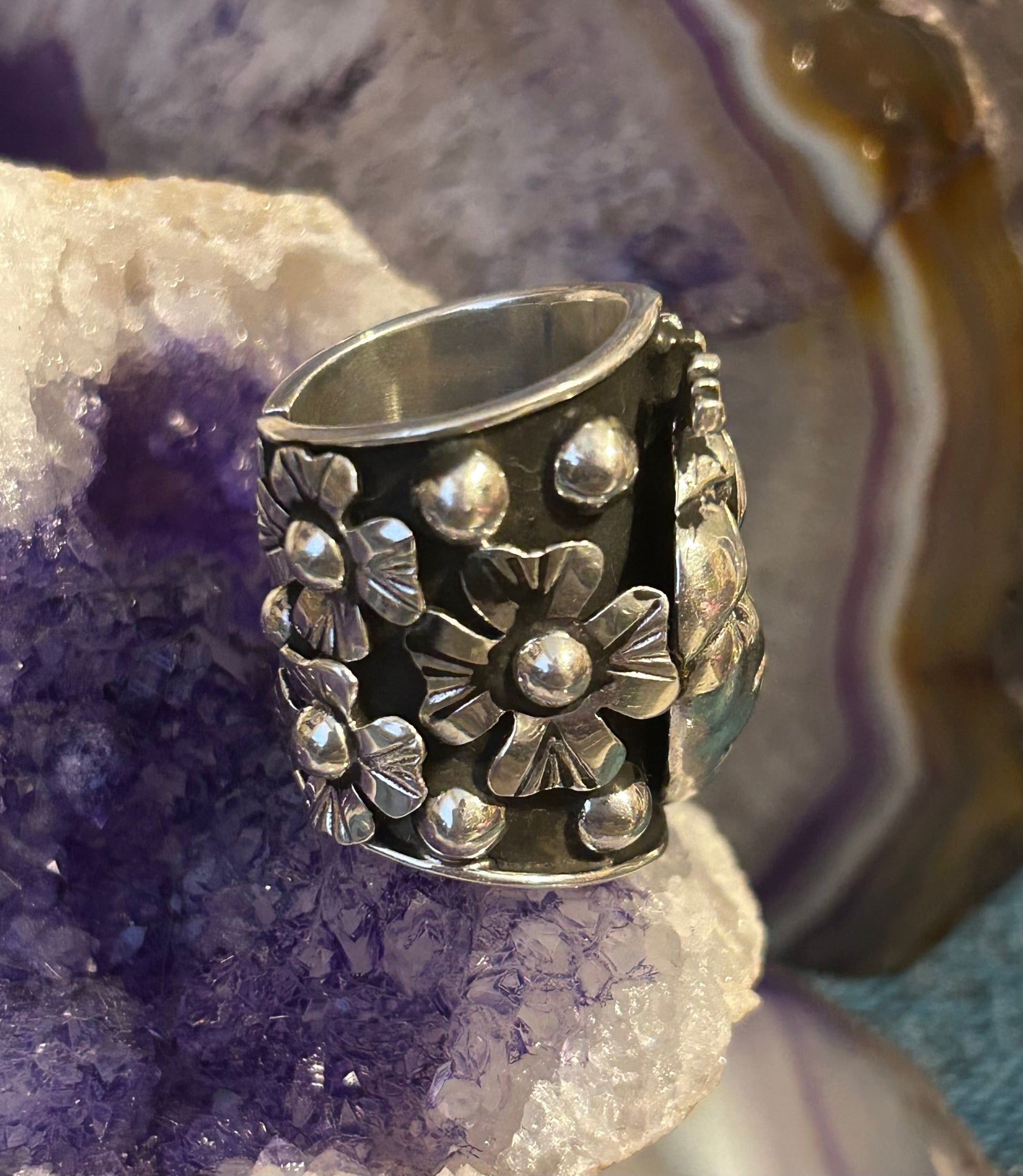 Beautiful sterling silver ring made by the amazing silversmiths in Taxco, Mexico. Very wide band with 3d accents of anatomical heart and flowers. Fits best ring sizes 5-7. |