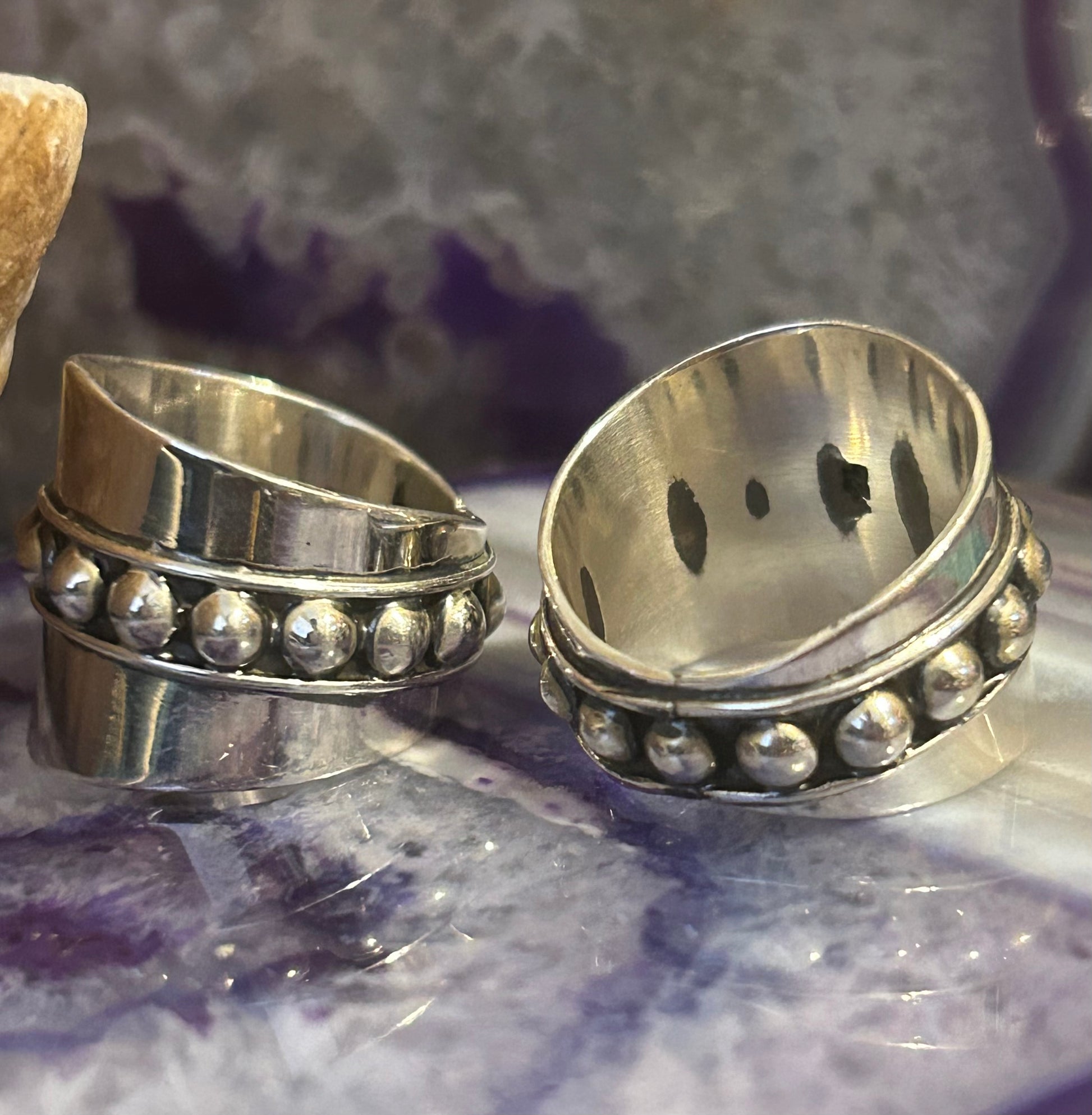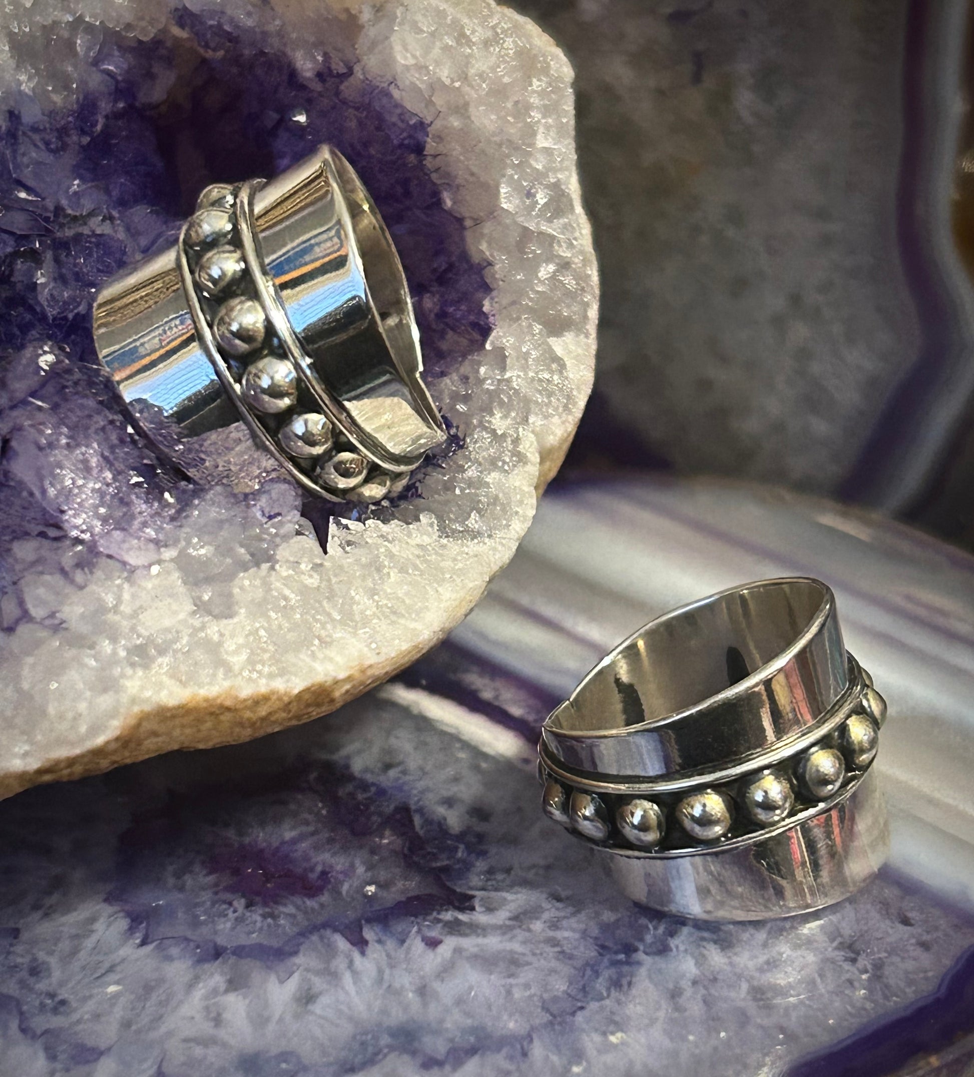 Beautiful sterling silver ball beaded wide band rings made in Taxco Mexico.