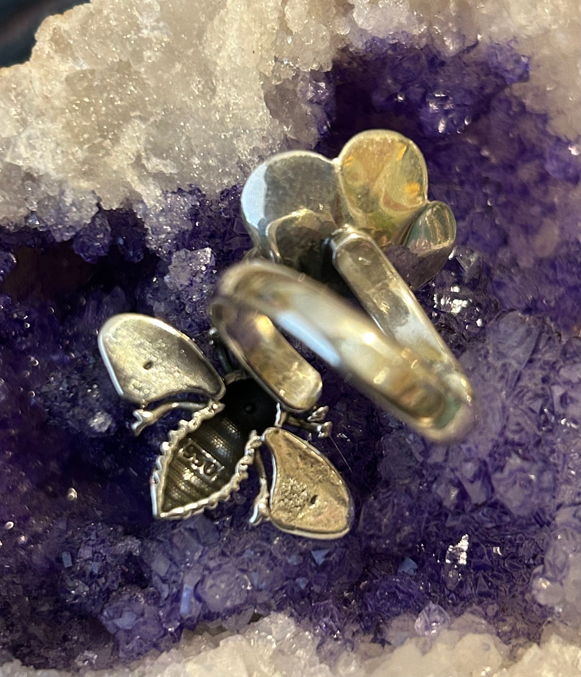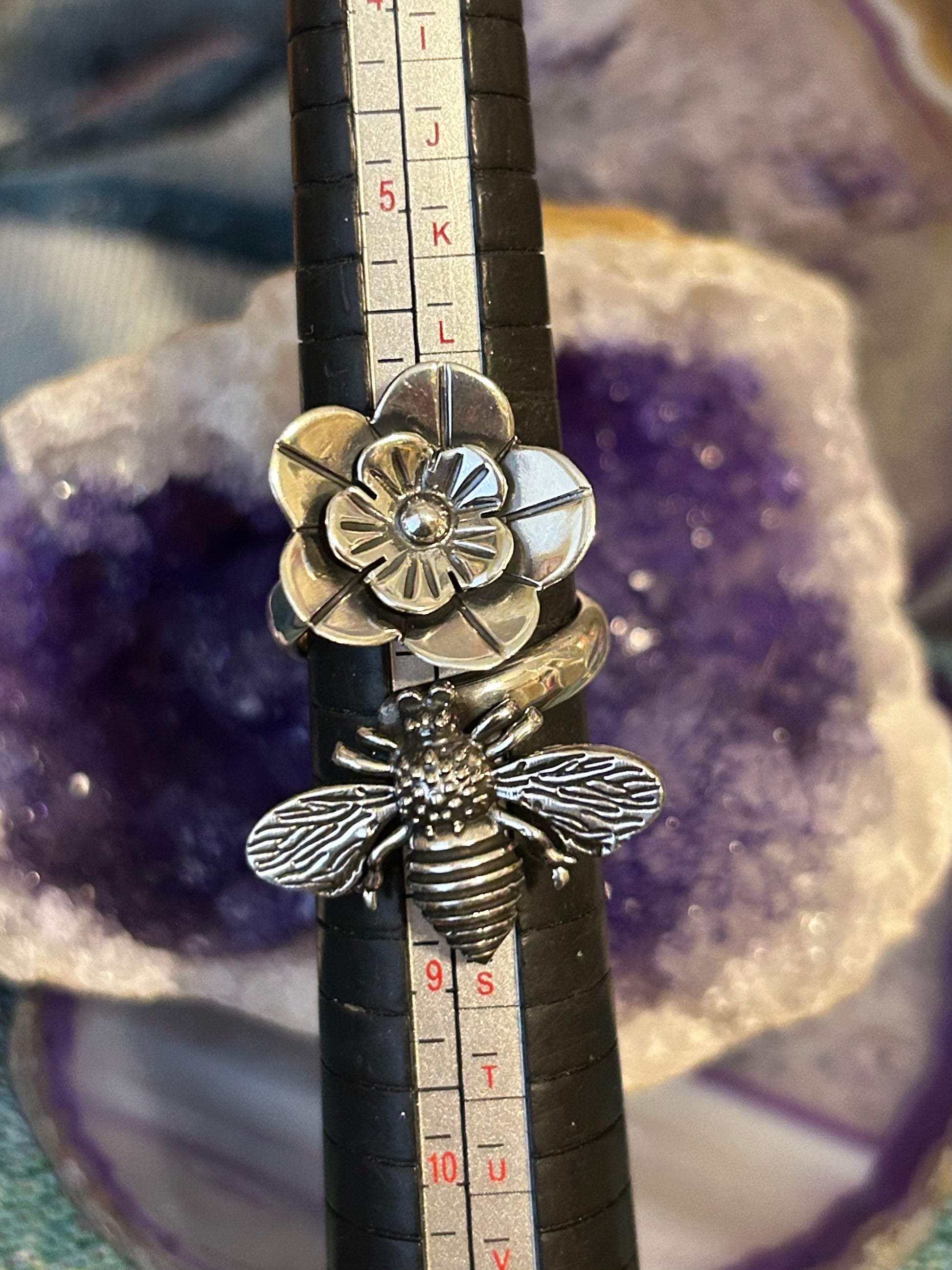 Gorgeous Sterling silver handmade bee and flower adjustable bypass ring. Made in Taxco Mexico by the silversmiths we work with there and it comes direct from there. Check out what it looks like set at different sizes in the photos. |