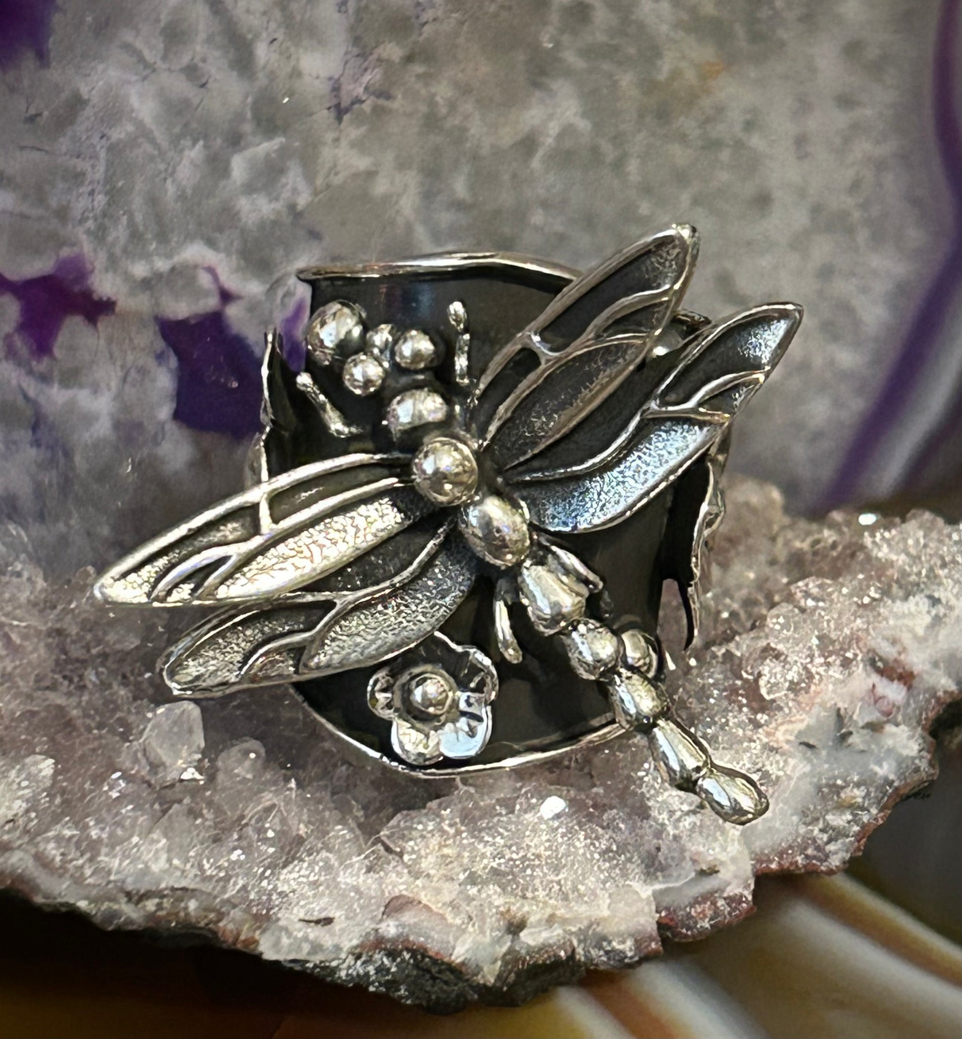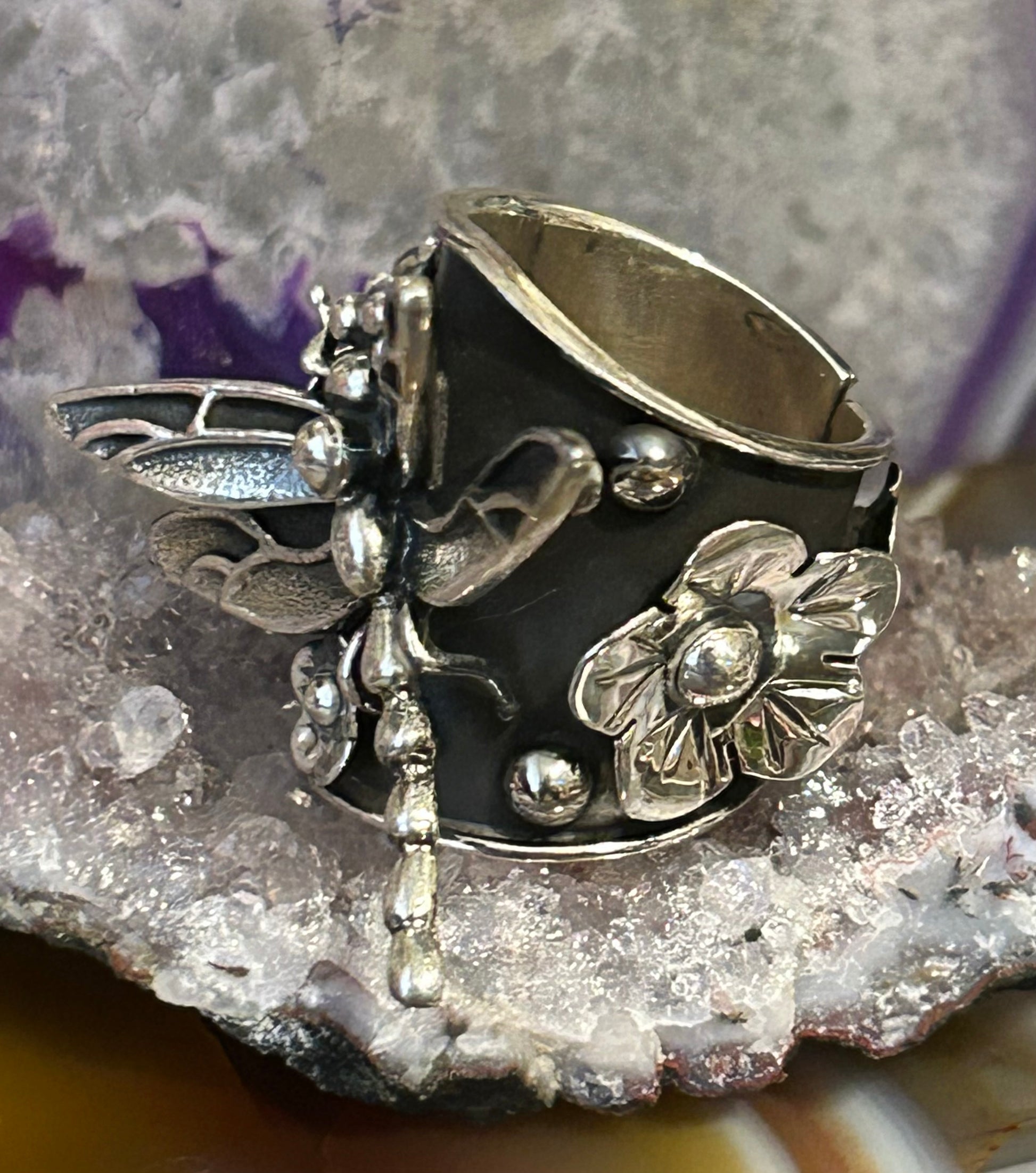 Sterling Silver Taxco Mexico Dragonfly And Flower Statement Ring