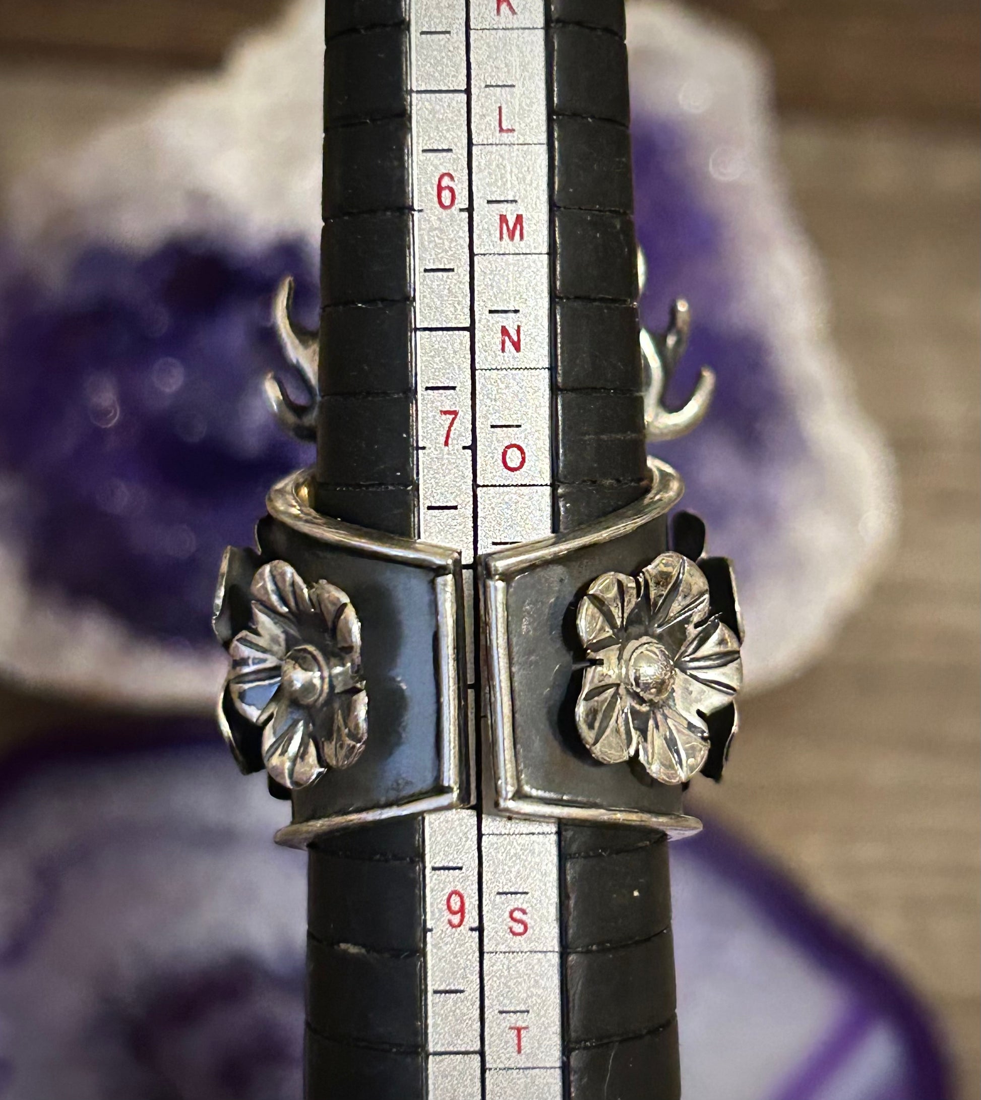 Amazing handmade sterling silver ring from taxco Mexico. Gorgeous “3D” accents. Has adjustability, fits best sizes 7.5-9.5 Carefully sourced and curated by Guz. |