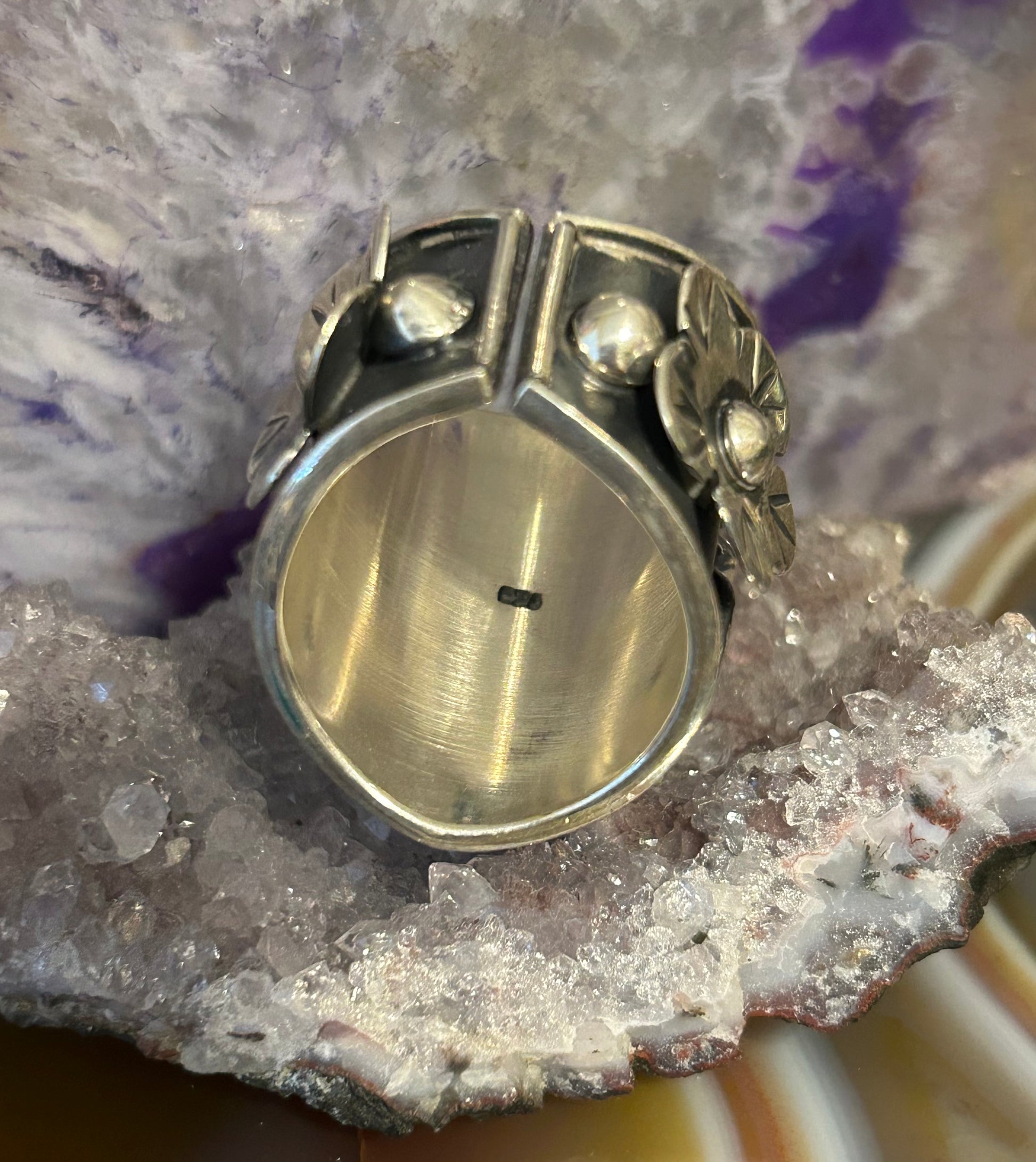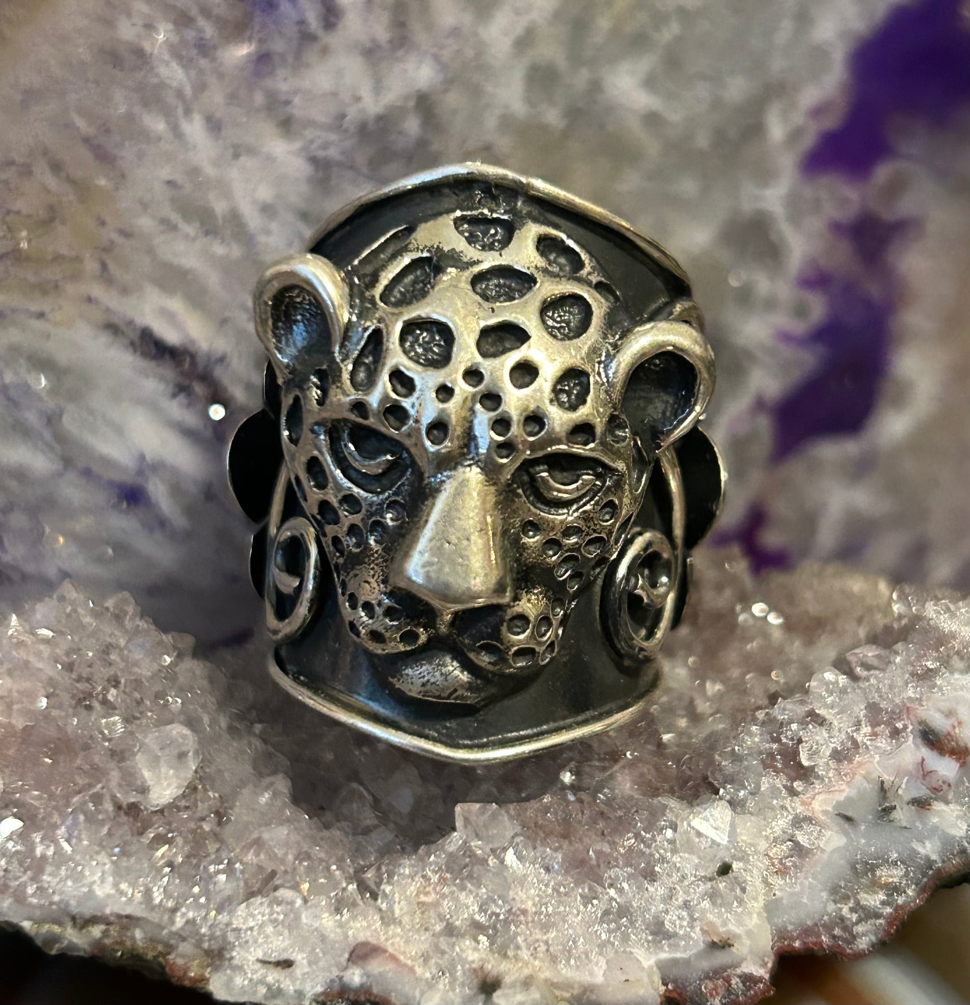 Sterling Silver Taxco Mexico Handmade Jaguar/Cheetah & Flowers Ring Adjustable