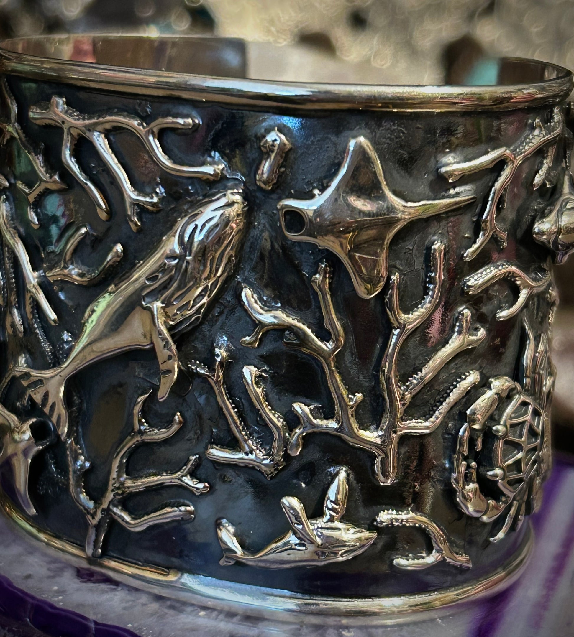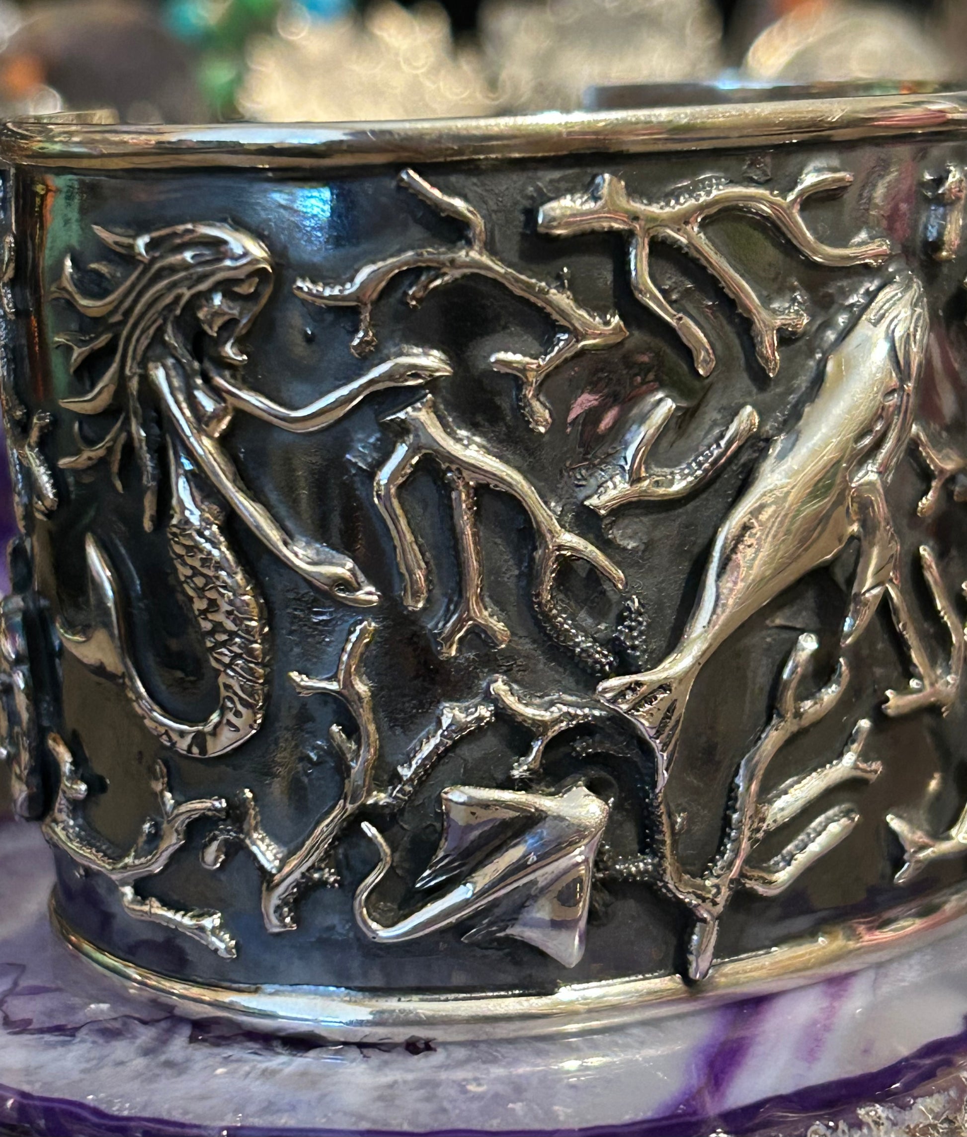 Beautiful handmade and one of a kind handmade in Taxco, Mexico, sterling silver cuff. Wide band cuff with gorgeous 3D sea life accents. Whales, dolphin, mermaid and more! Does have some flex to it and would fit best sizes 6.5-7.5 This piece was special made for Guz Love’s curations by the silversmiths in Taxco and is a one of a kind piece. |