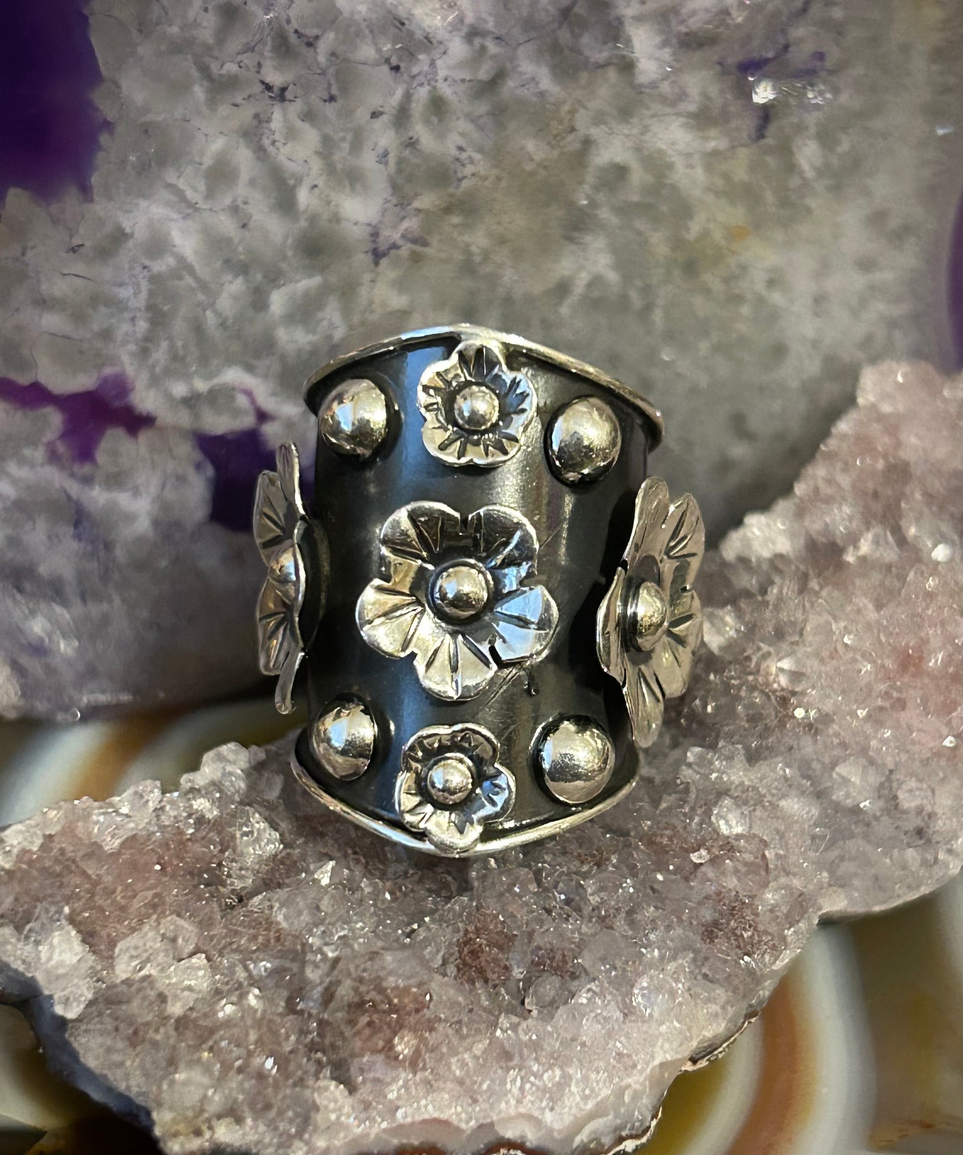 Sterling Silver Taxco Mexico Thick Floral Wide Band Ring