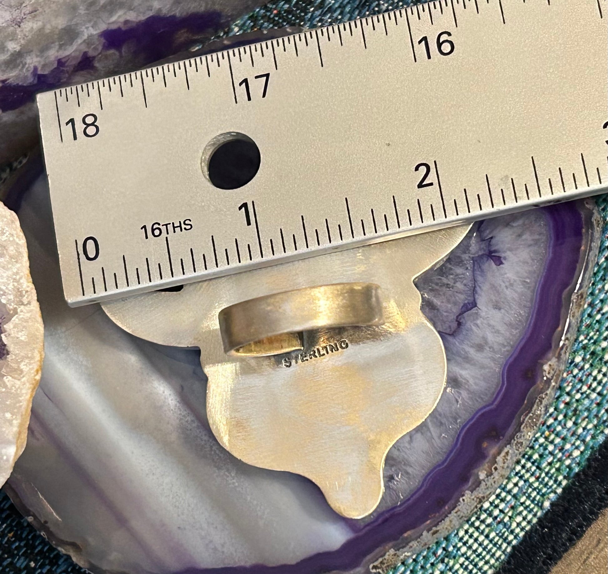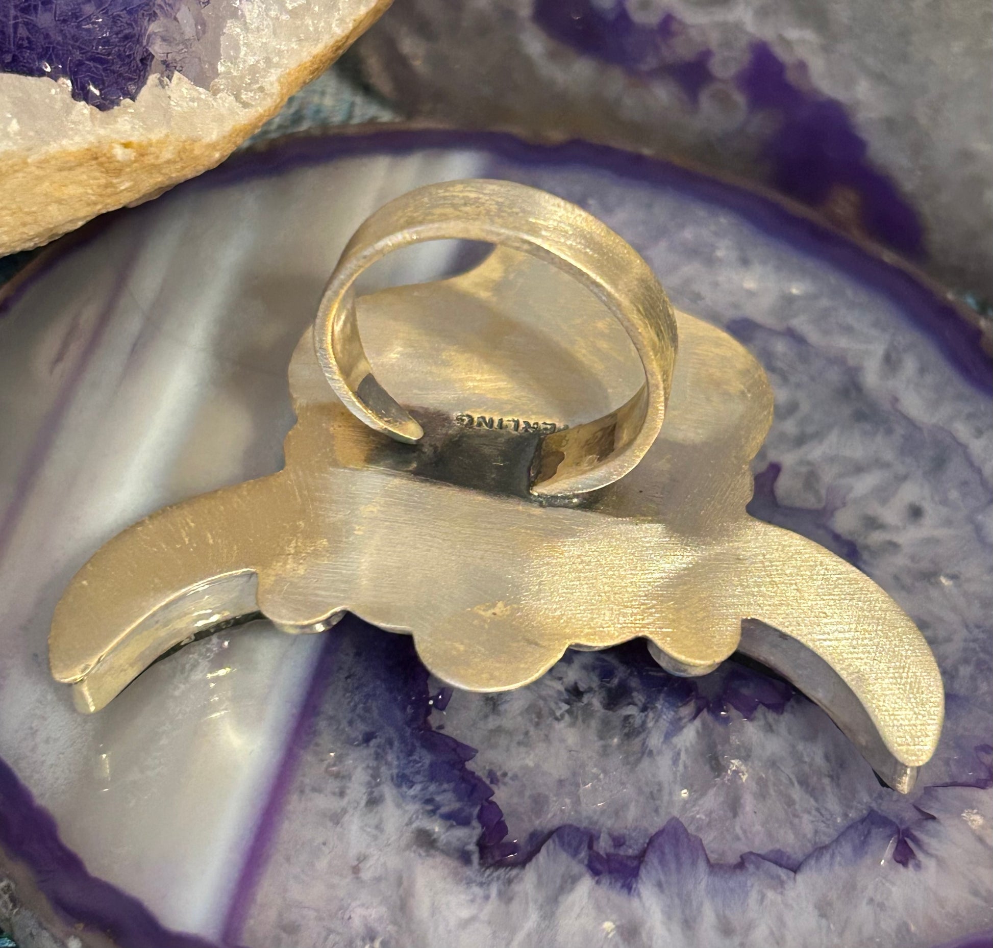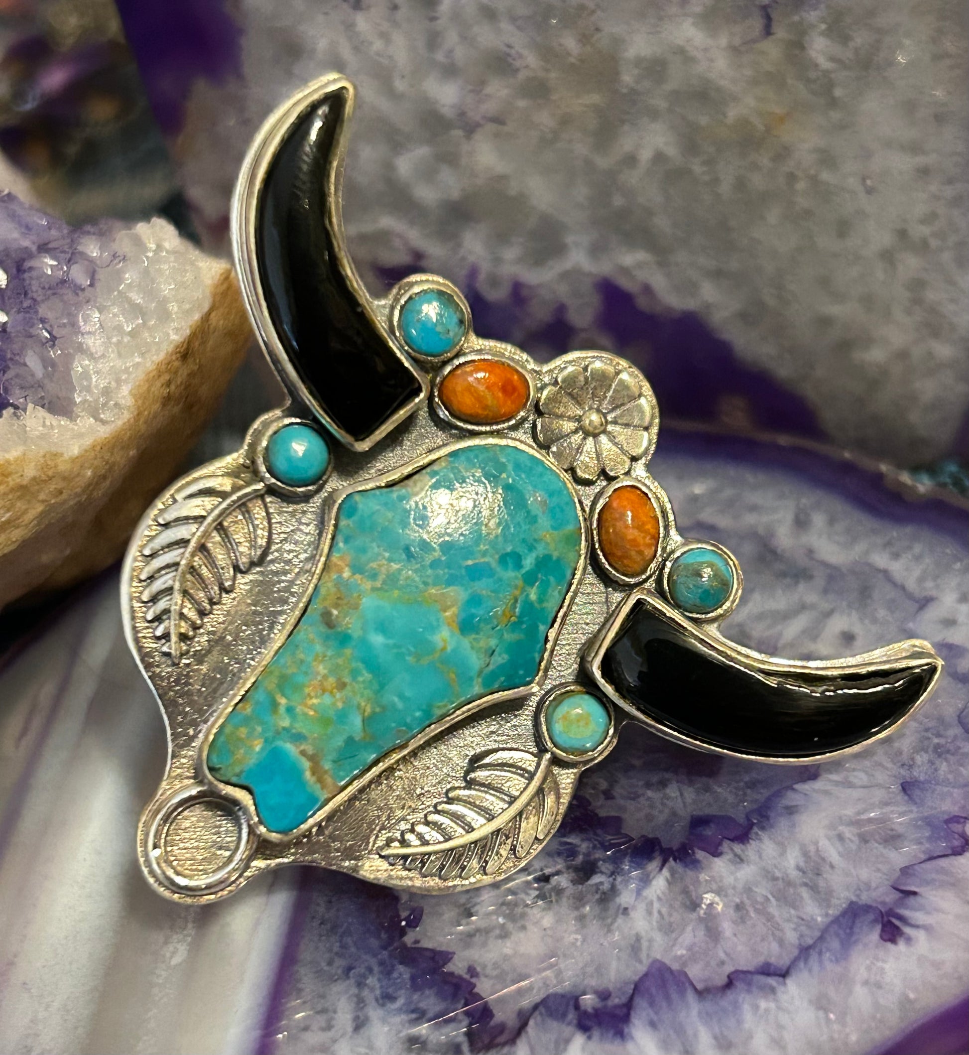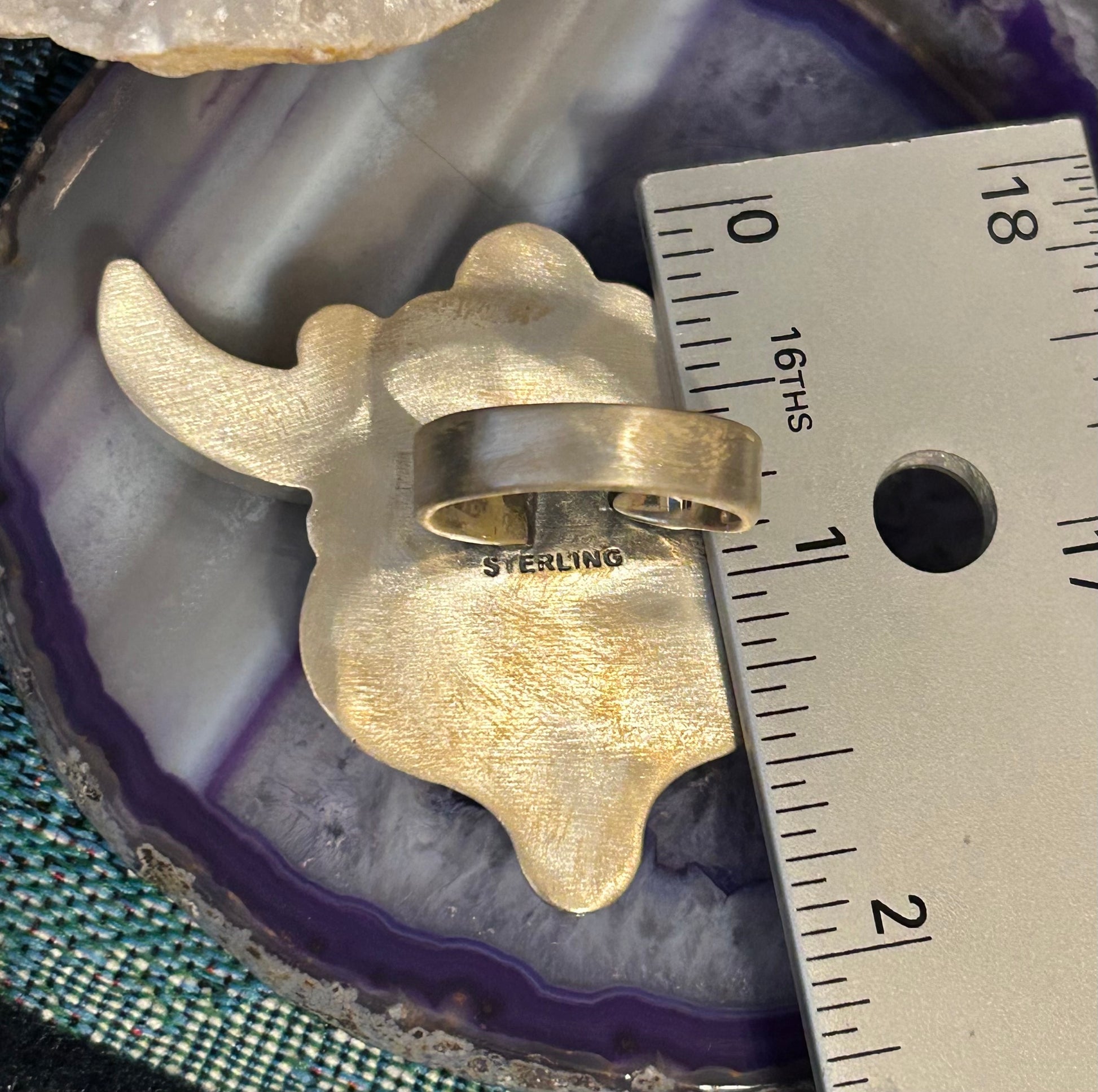 Gorgeous large Sterling silver ring of a long horn bull featuring turquoise, black onyx, and spiny oyster stones.