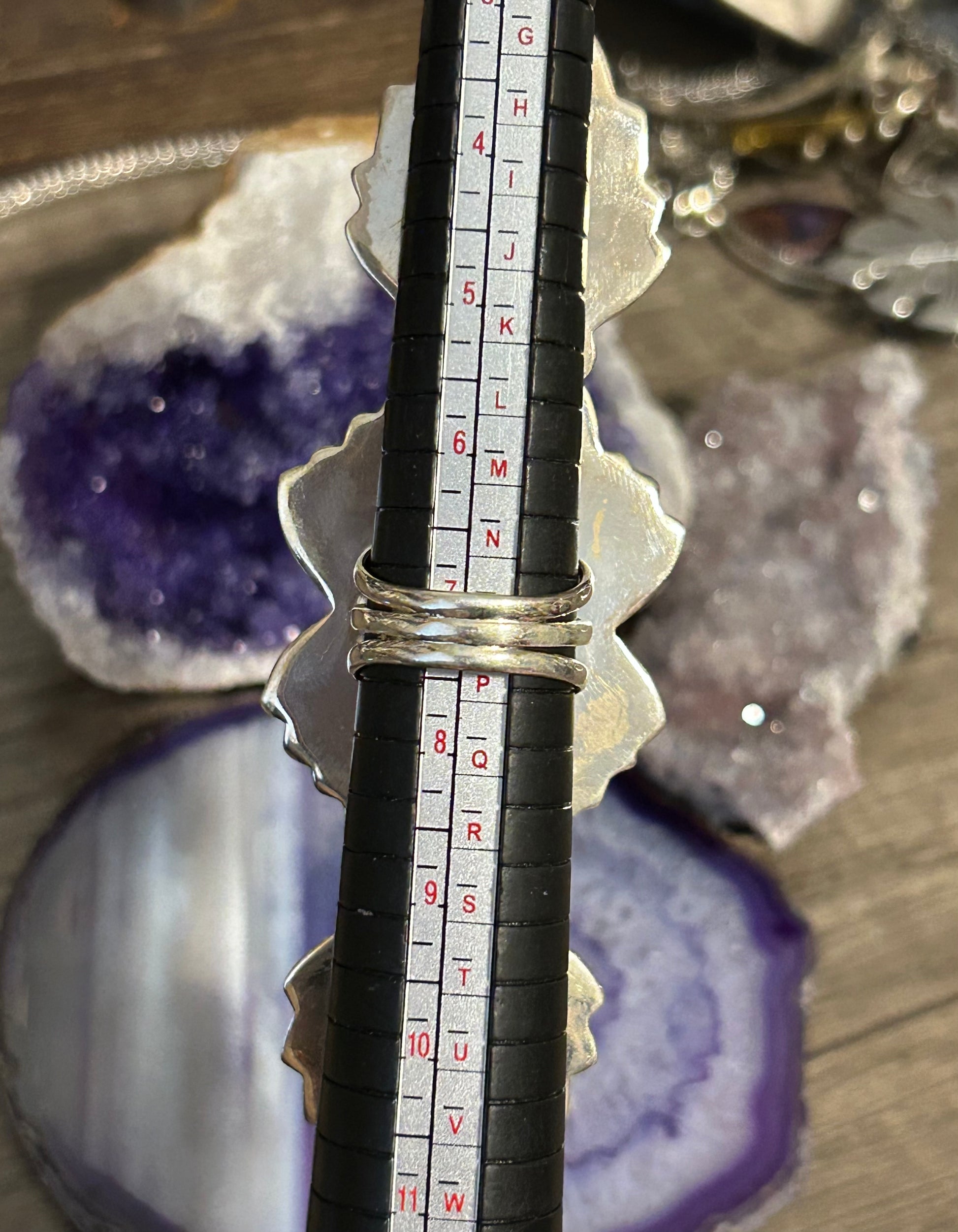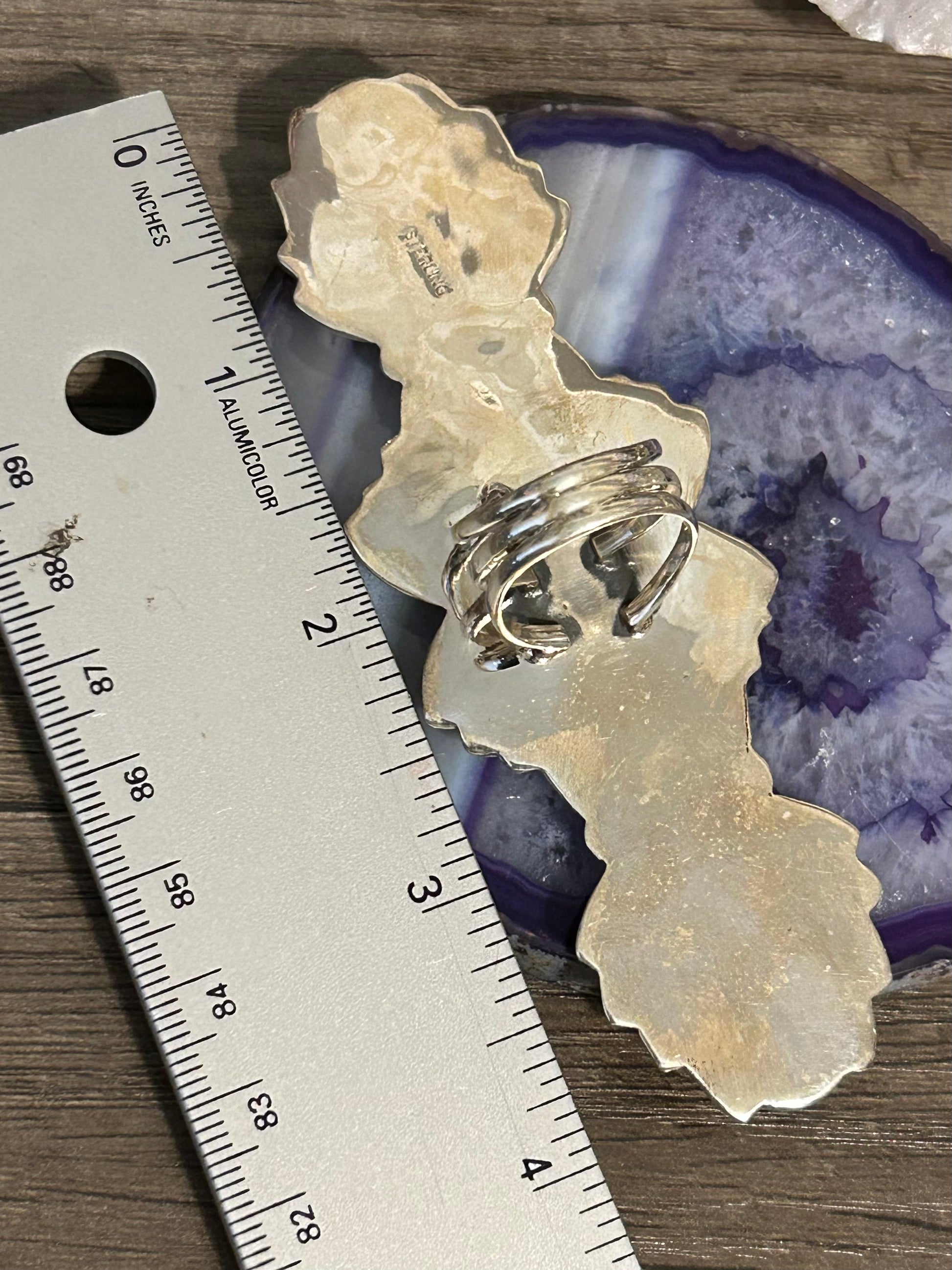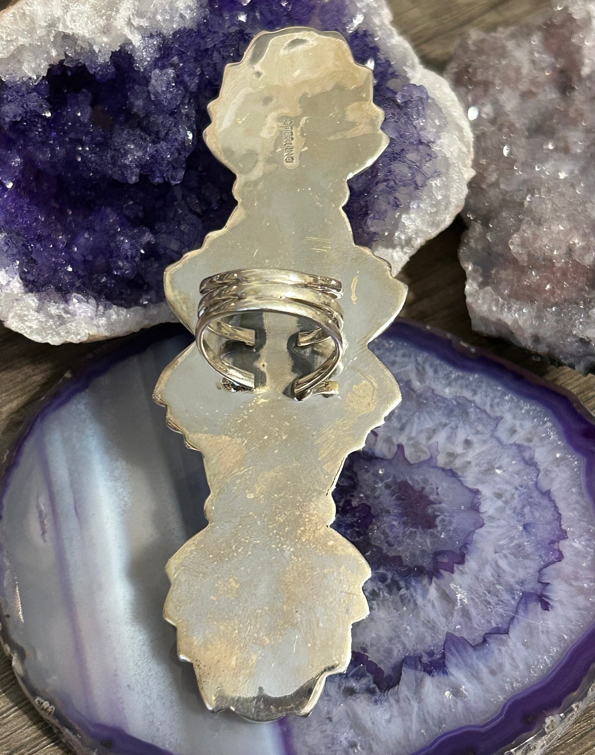Gorgeous four inch long sterling silver ring with spiny turquoise and a pinkish purple Mojave turquoise. Size 7. A very unique statement piece!