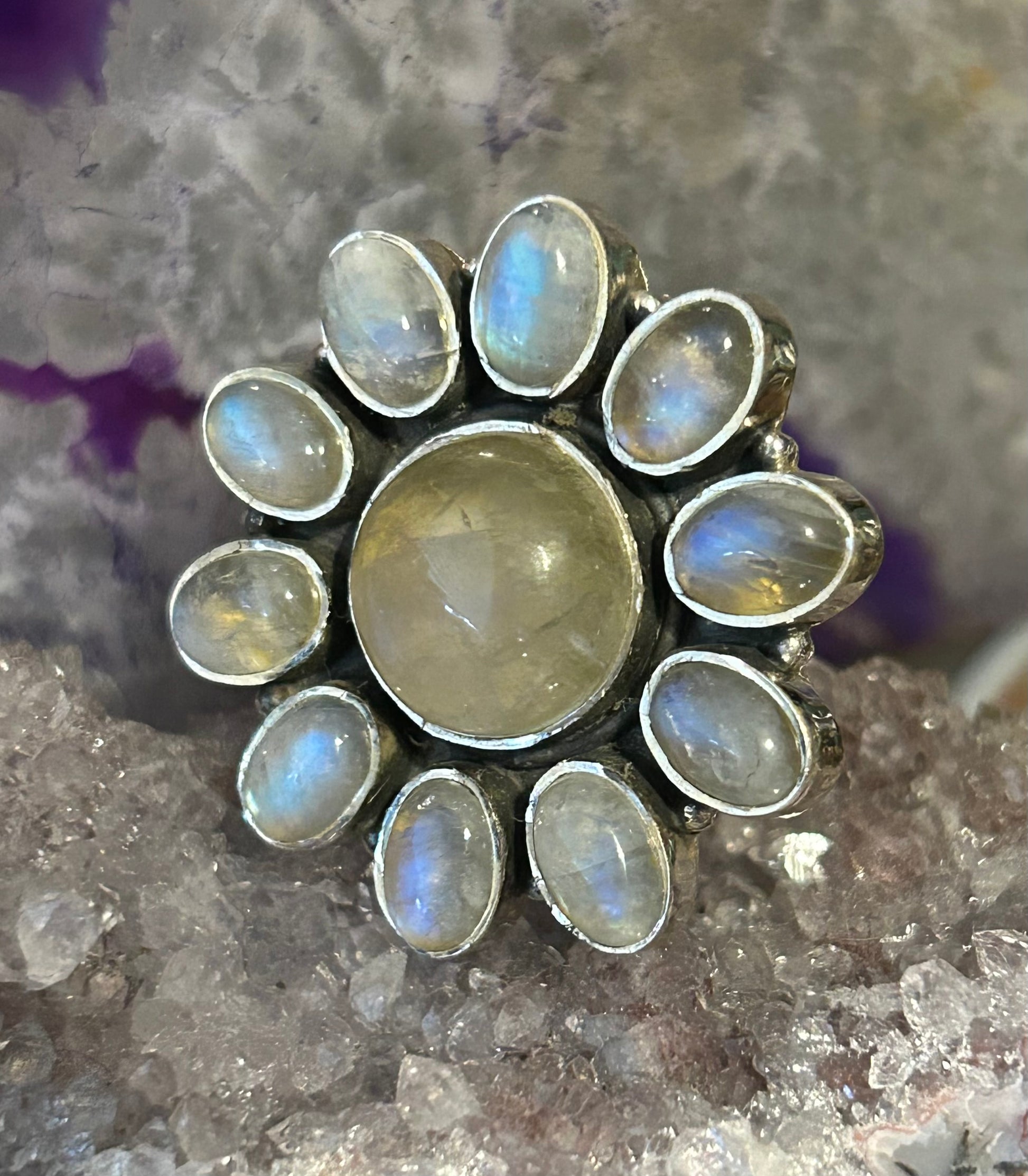 Sterling Silver Yellow Moonstone Round Circle Flower Ring Size 6.5