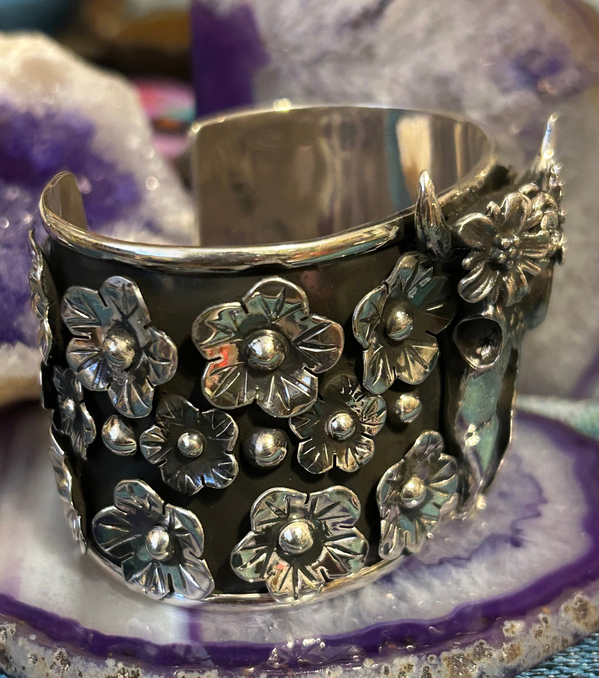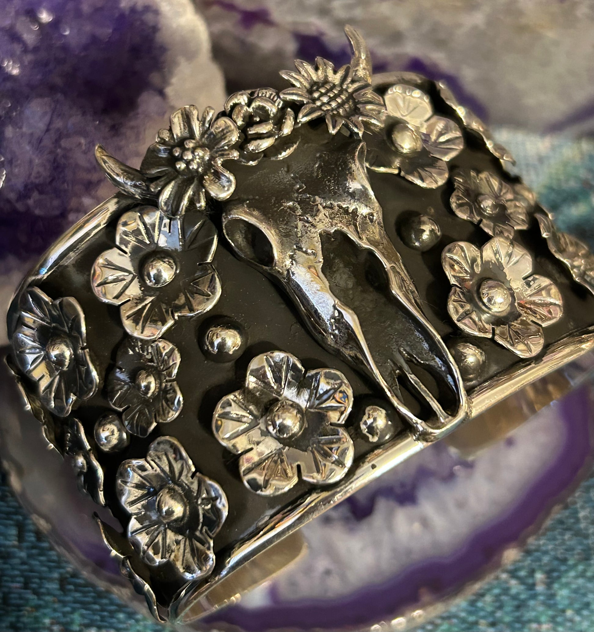 Gorgeous Sterling silver cuff bracelet made in Taxco, Mexico. Hallmark on inside of cuff. Beautiful 3D flower accents and bull skull with flower crown! Can be adjusted and would fit best sizes 6-7.5 best.