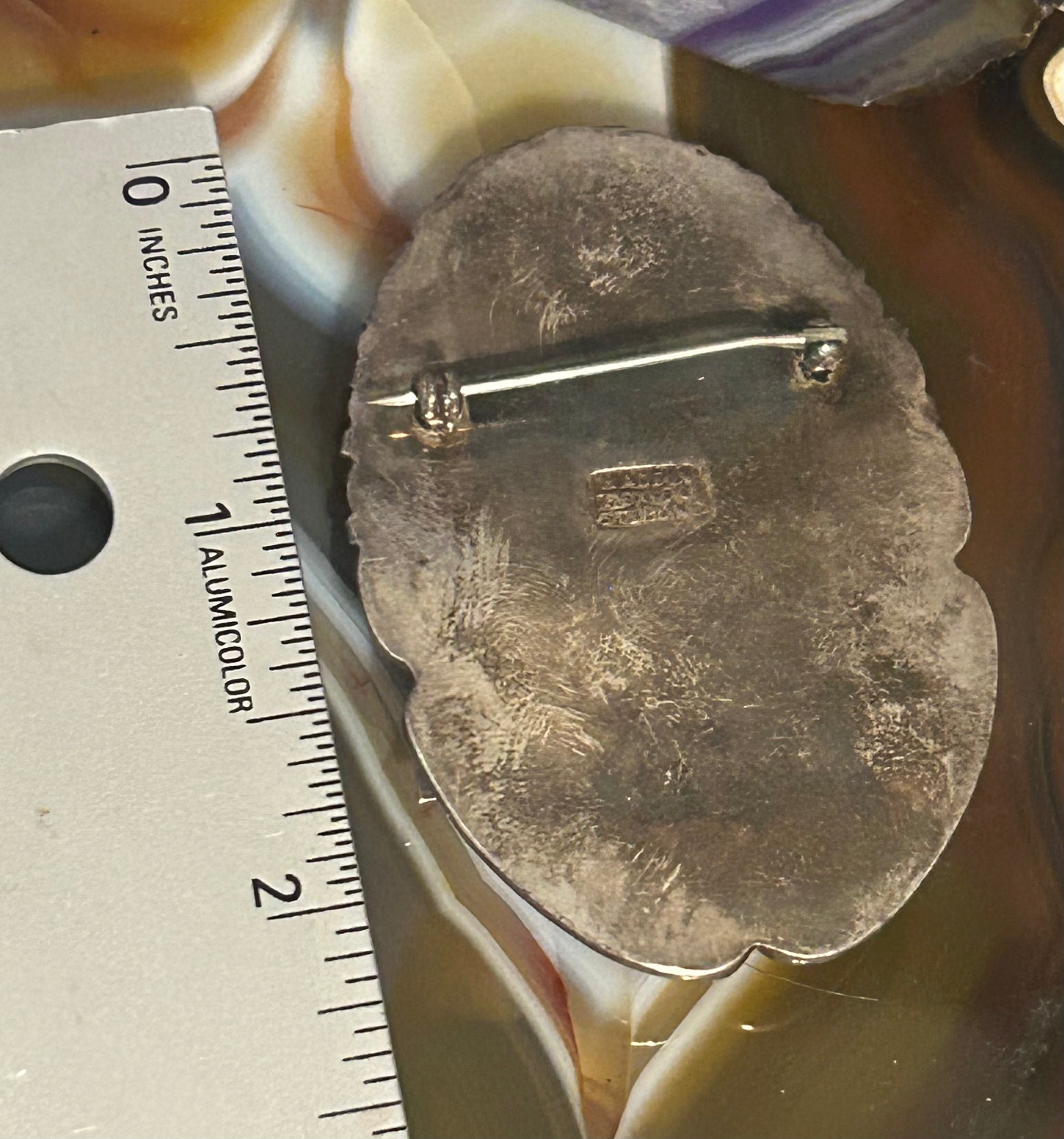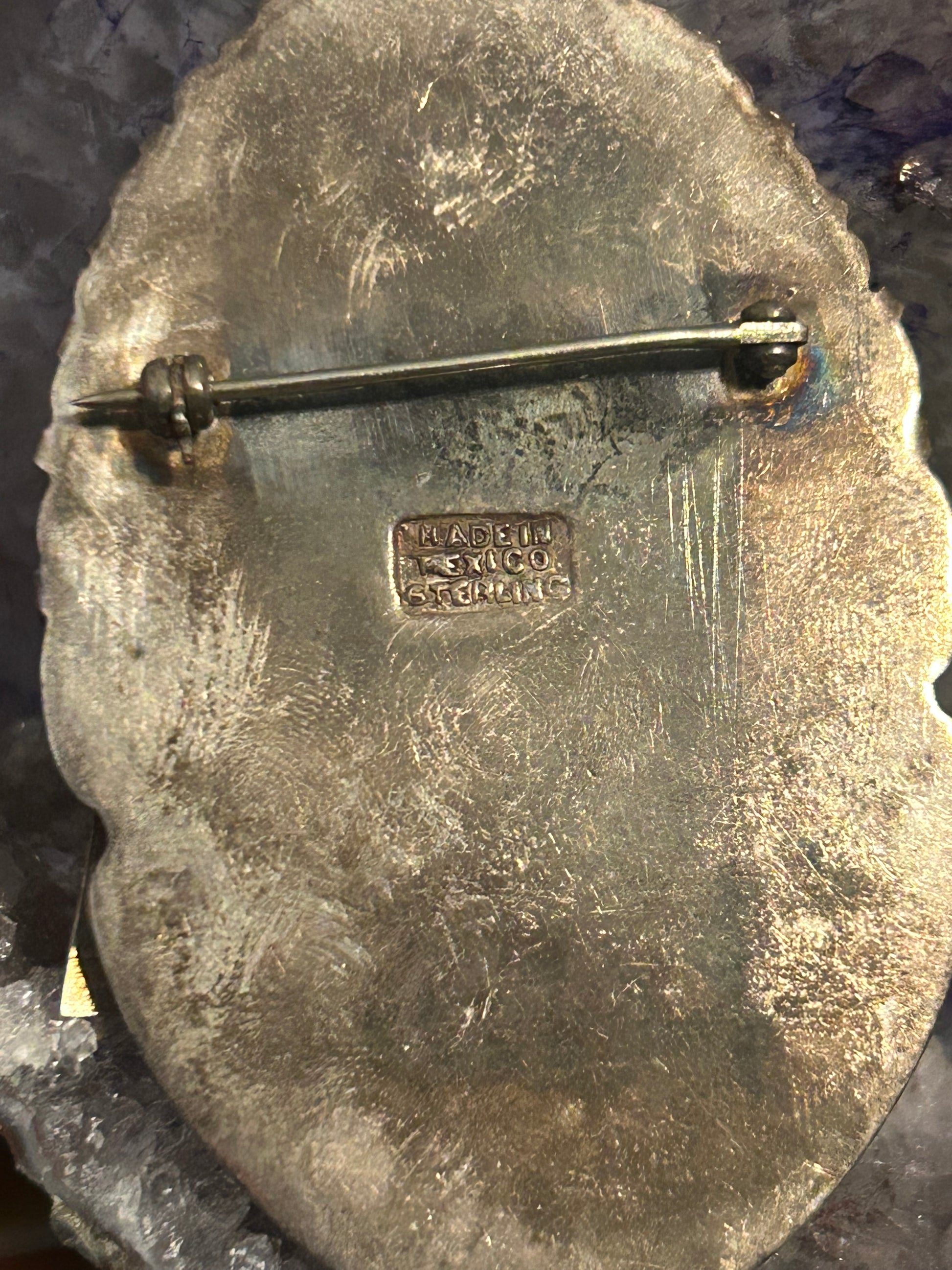 Amazing vintage Mexico pin/brooch with natural stone carved warrior mask face. It is a natural stone but I’m unsure of the exact stone.