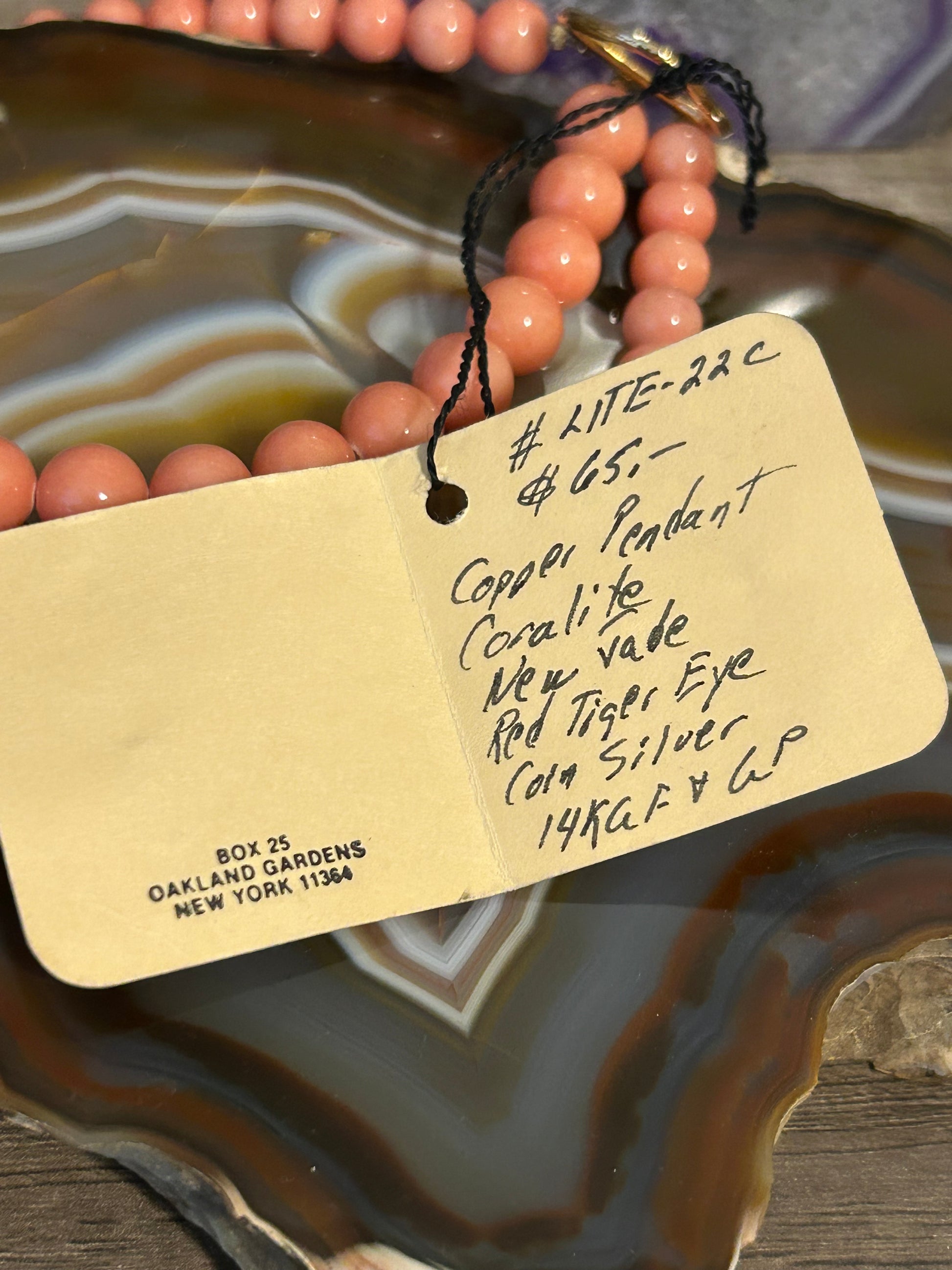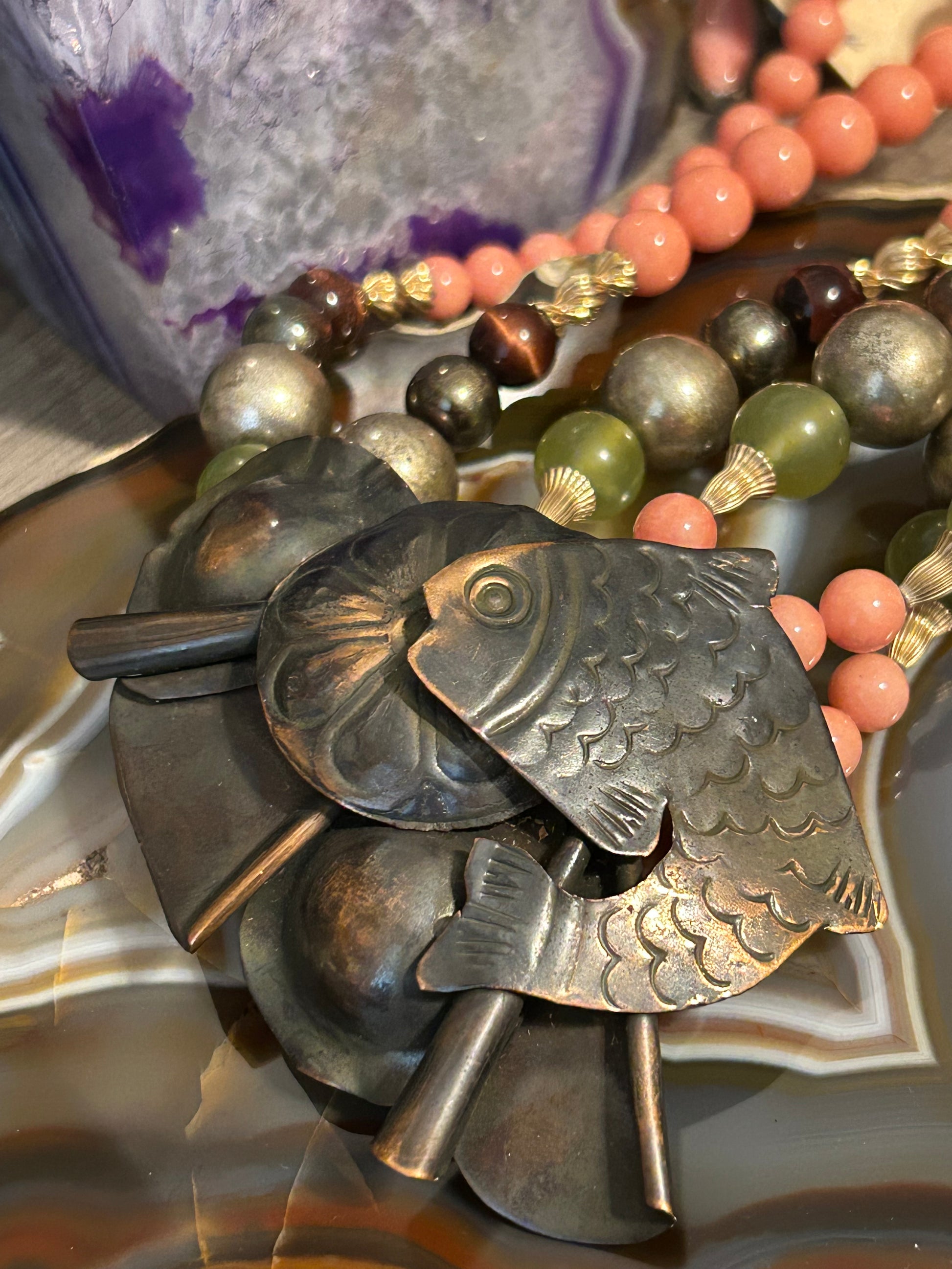Gorgeous deadstock ro-do by Rosemary G necklace. Vintage from the 80s or 90s. 18 inches in length with natural stones. Tag in photos lists materials. Gold plated clasp. Really cool large copper fish pendant. All of my rosemary necklaces are directly from her estate. |