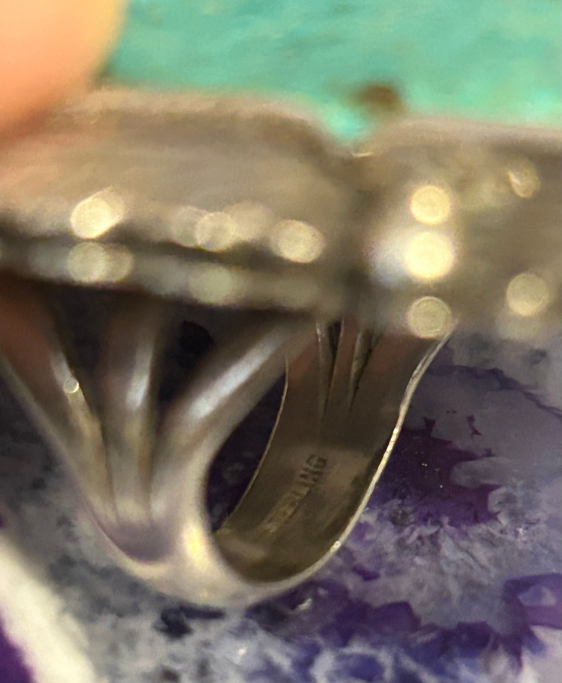 This is a HUGE beautiful estate handmade turquoise statement Ring made from sterling silver with large natural turquoise stone. Sterling silver 925 tested and hallmarked sterling. Ring size 8.5 Carefully sourced and curated by Guz. |