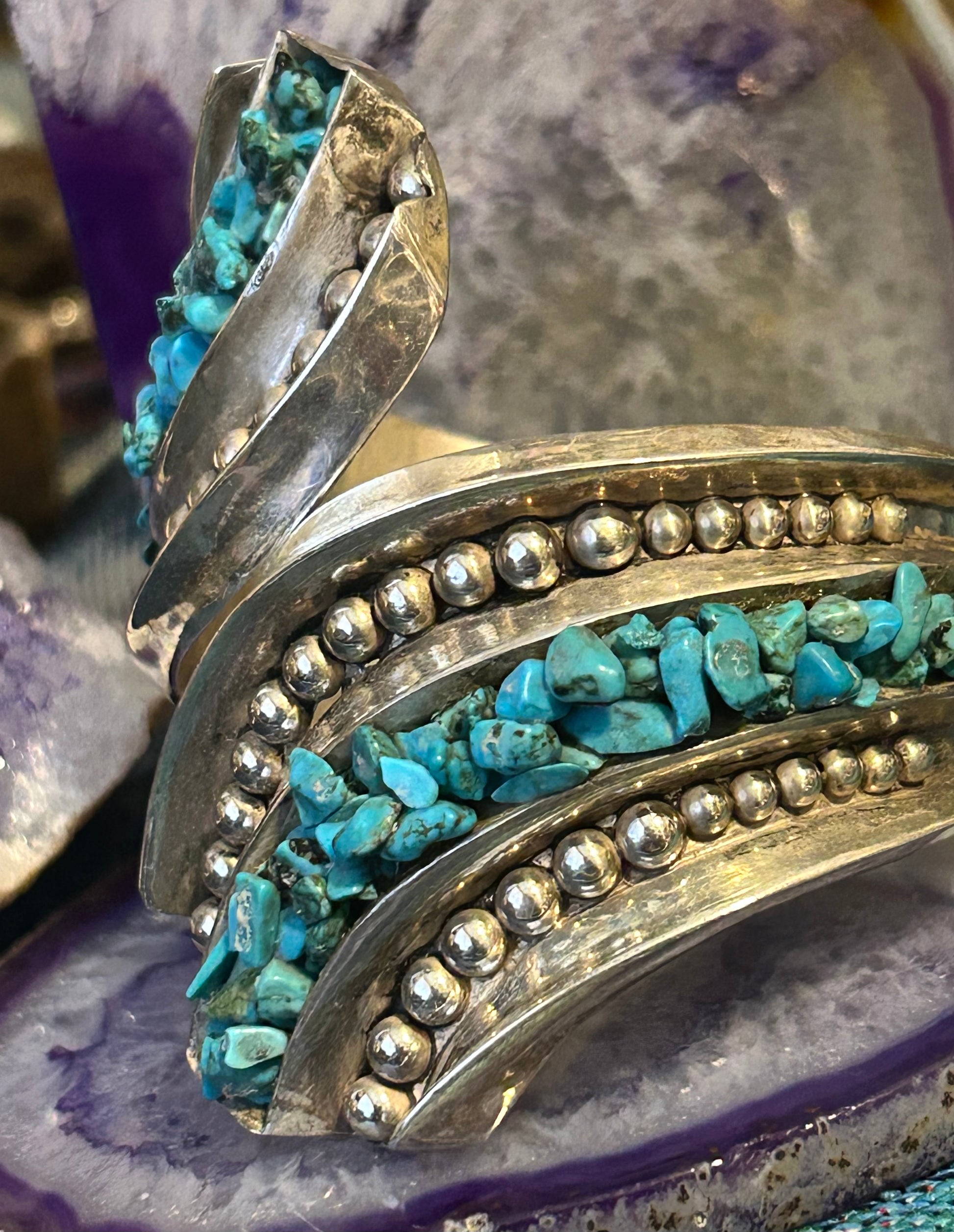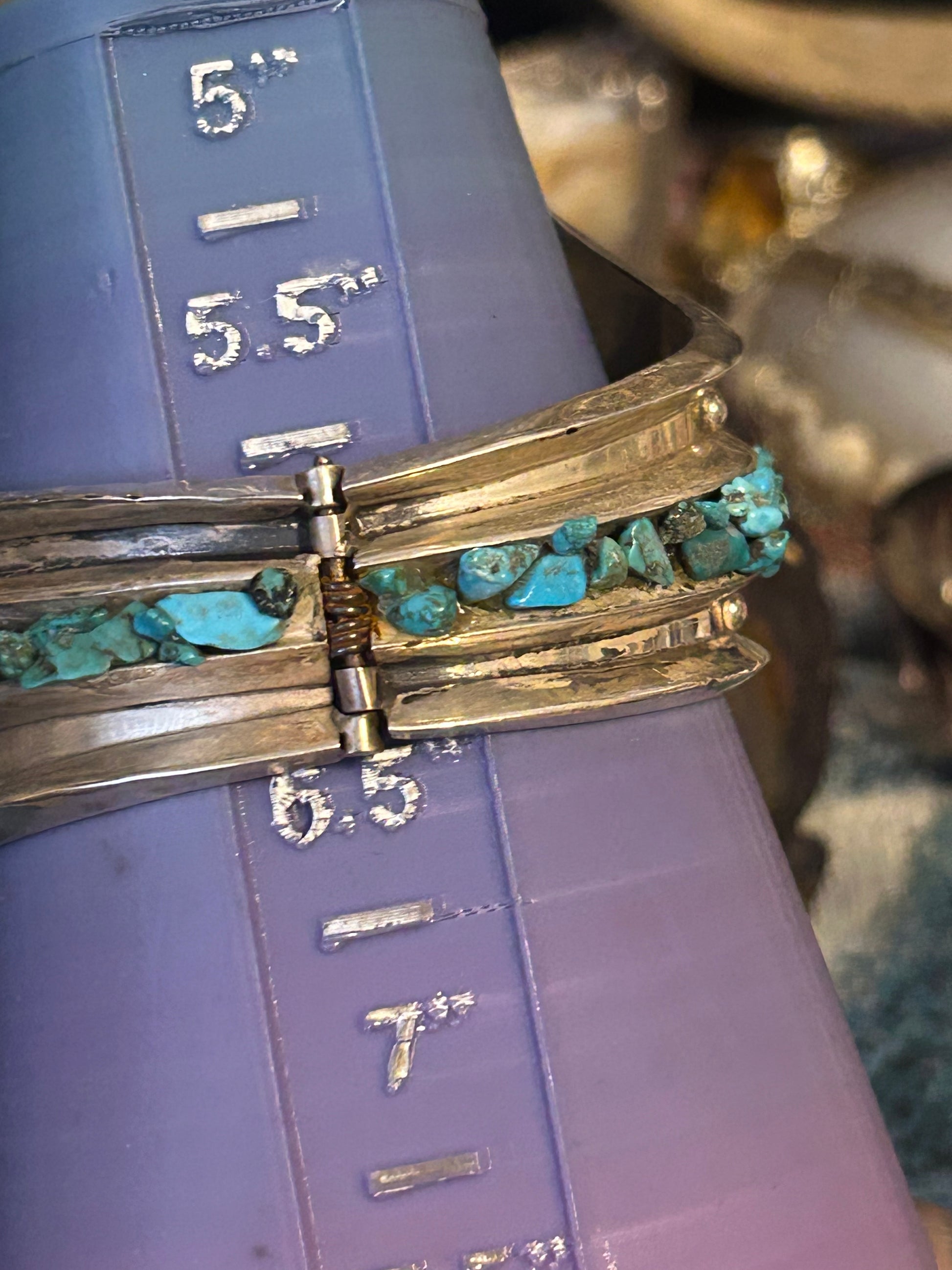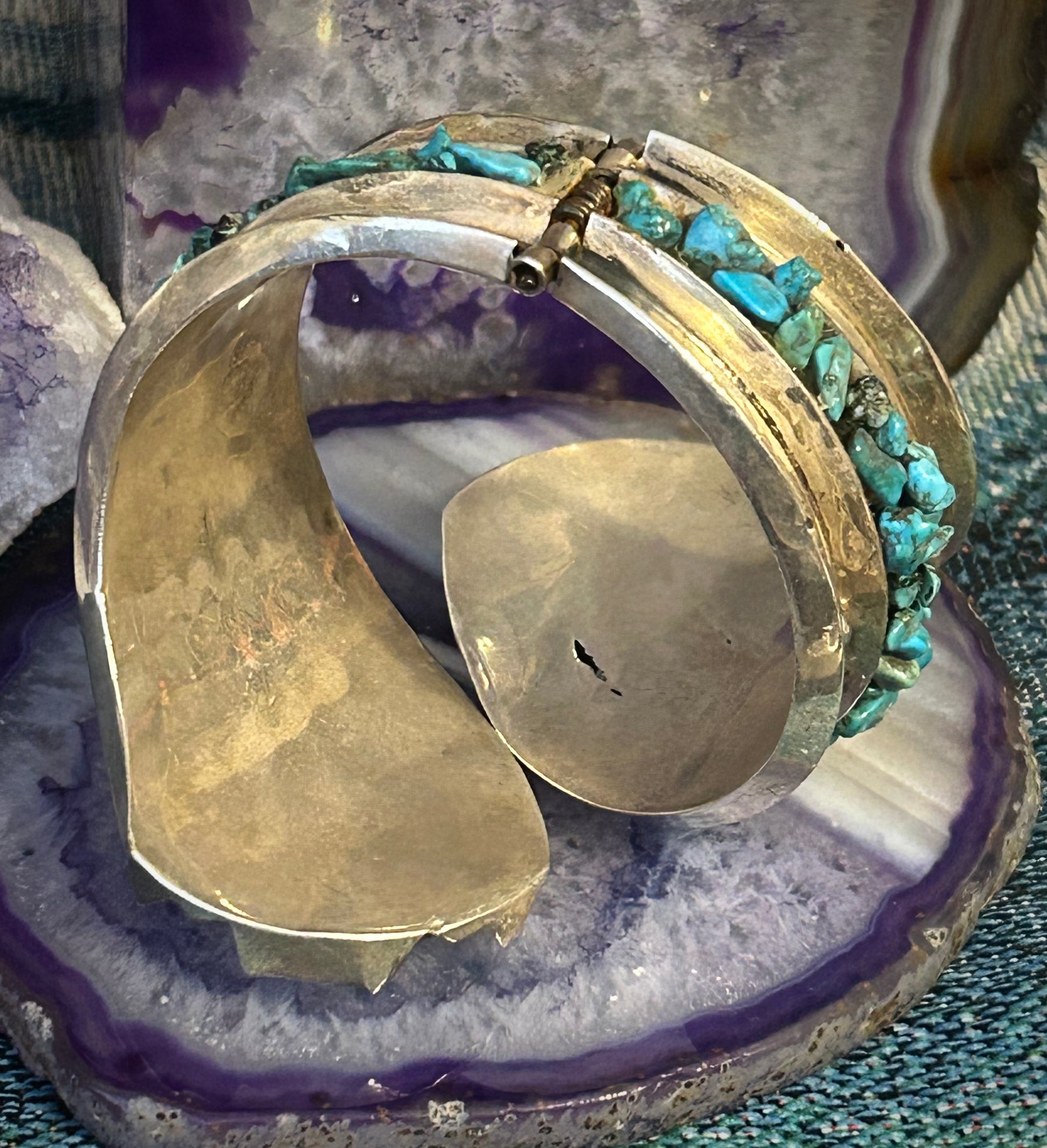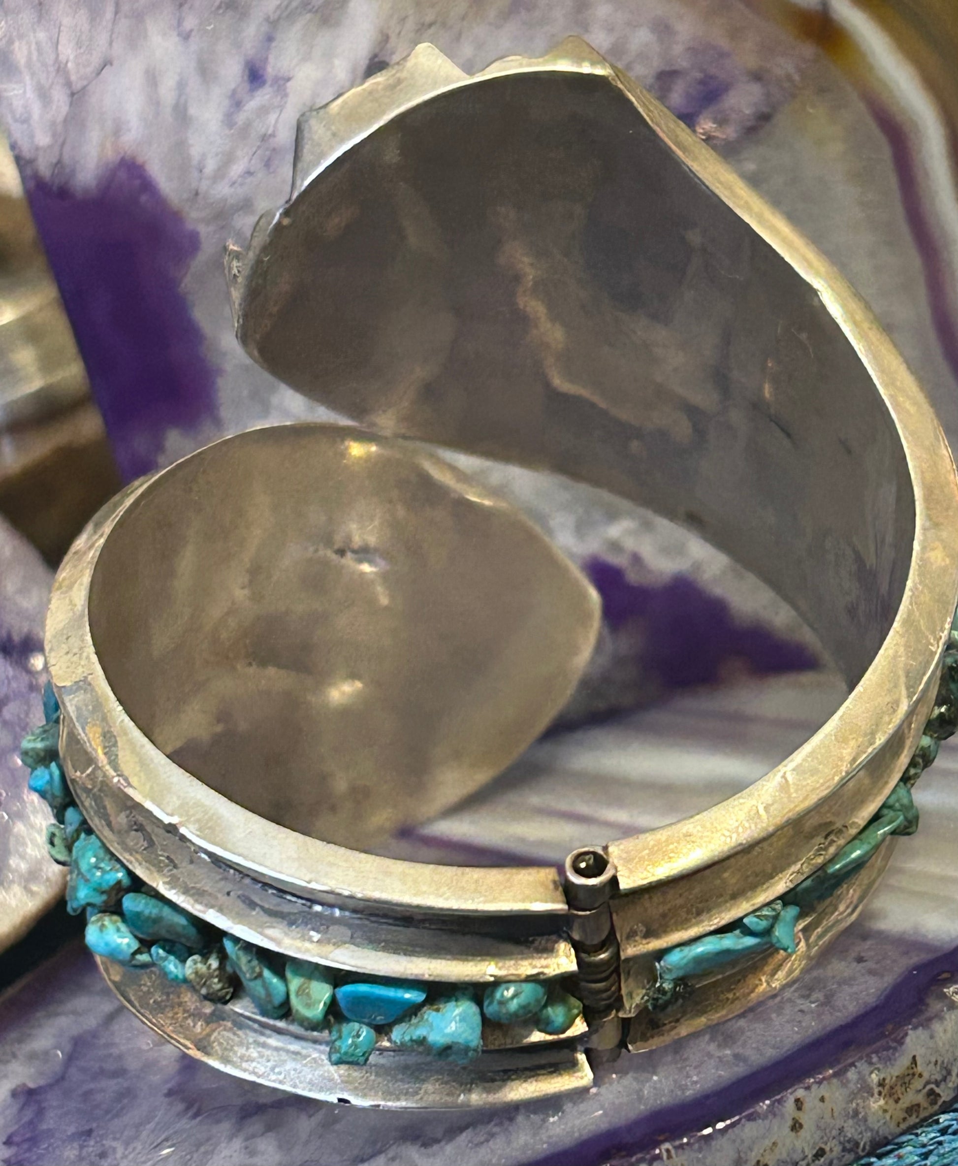 Has turquoise nuggets all around accenting this beautiful classic Mexican clamper.